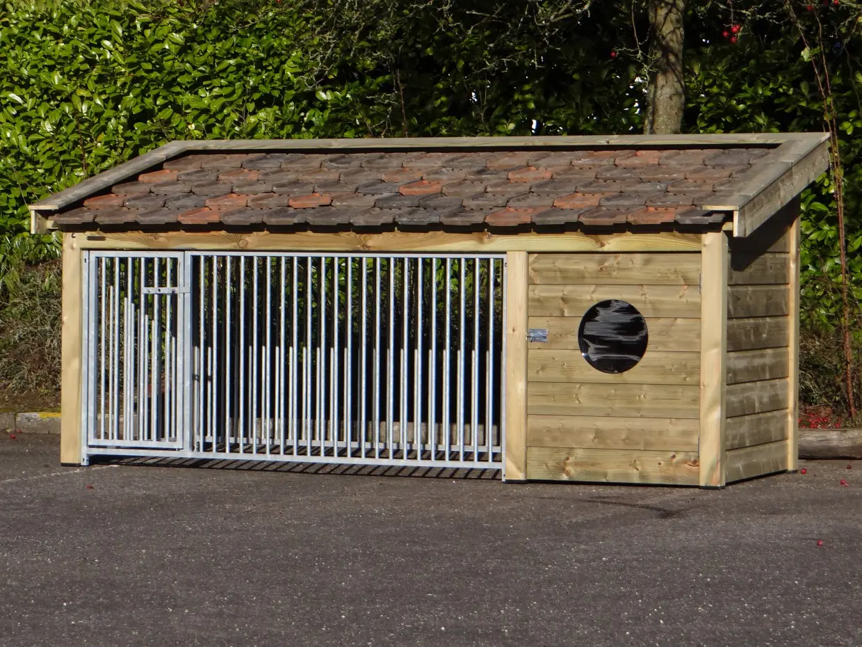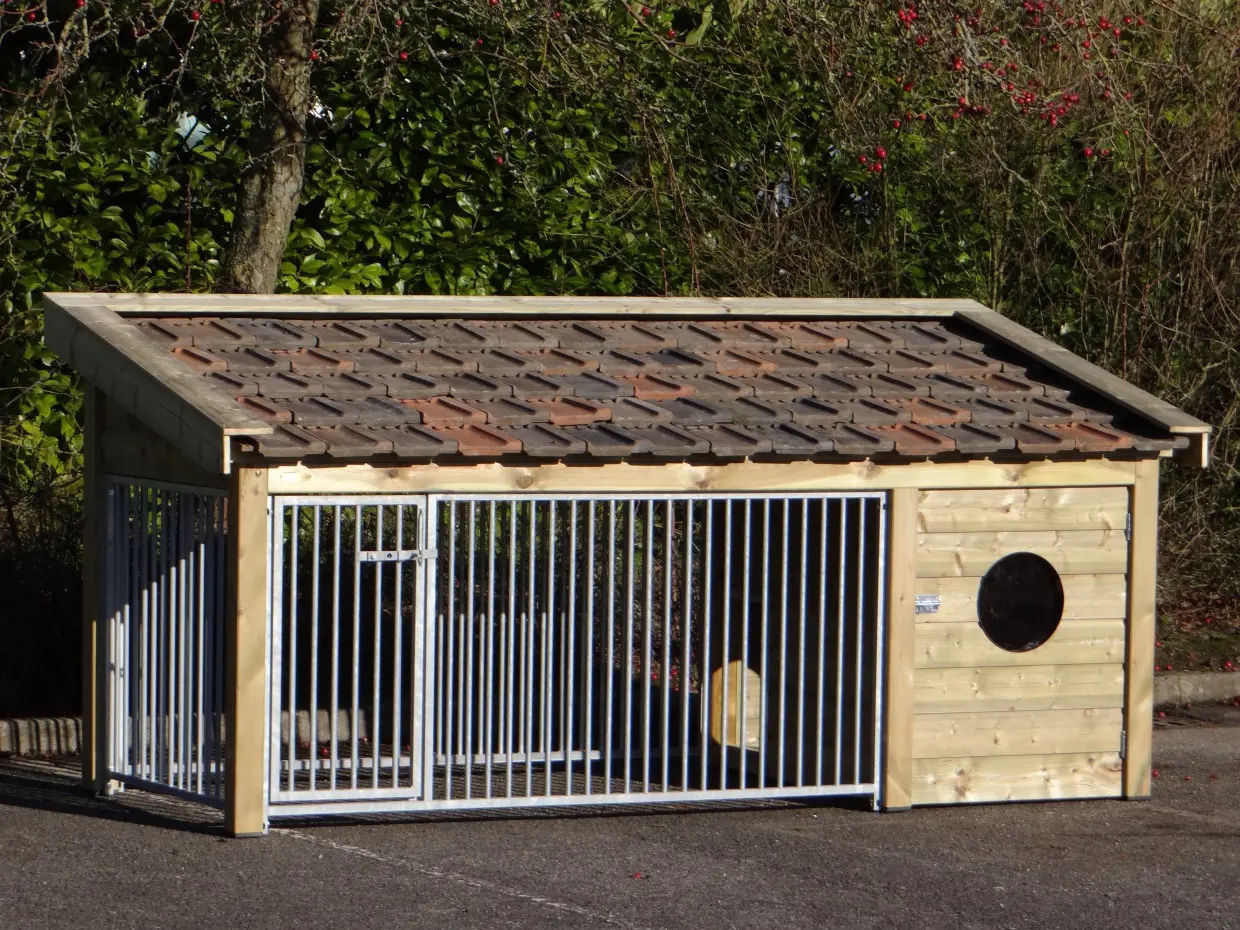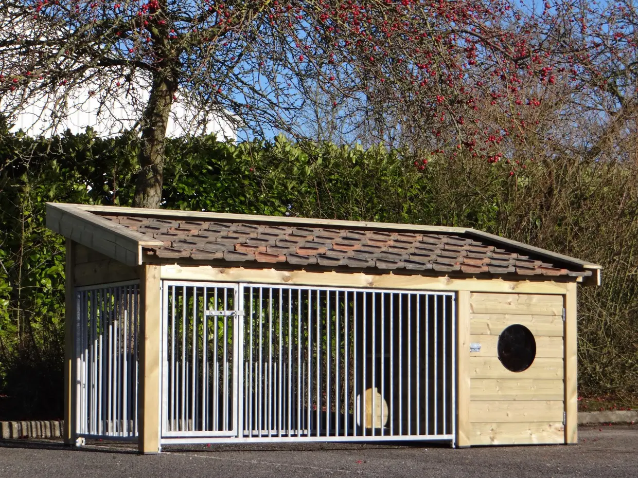 Dog kennel Roxy 3 has a buil-in sleeping compartment and a large run. The roof is provided with second-hand roof tiles, which are available in 3 colours. The floor is made of filmcoated plywood. The Roxy 3 has 3 mesh panels.