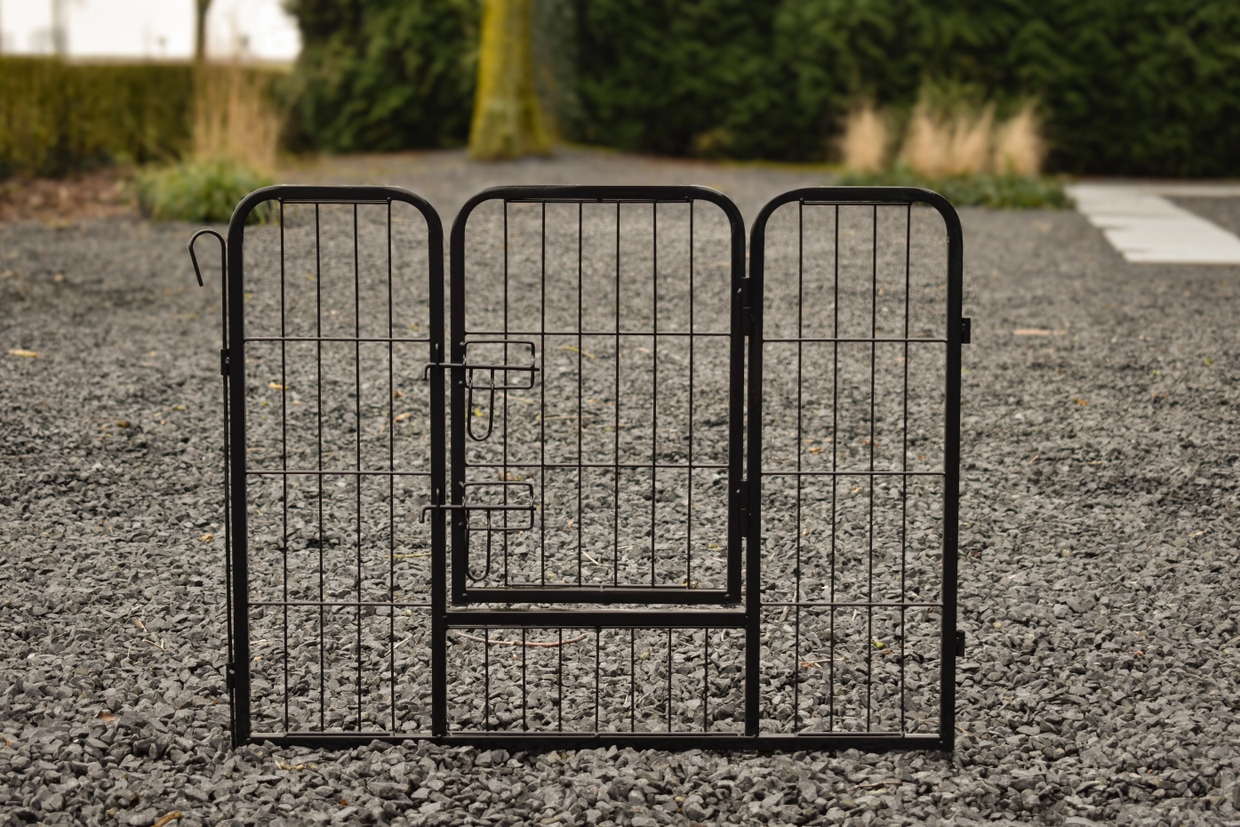 - The panels are connected with each other with long pins. With the pins you can secure the ren in the ground.