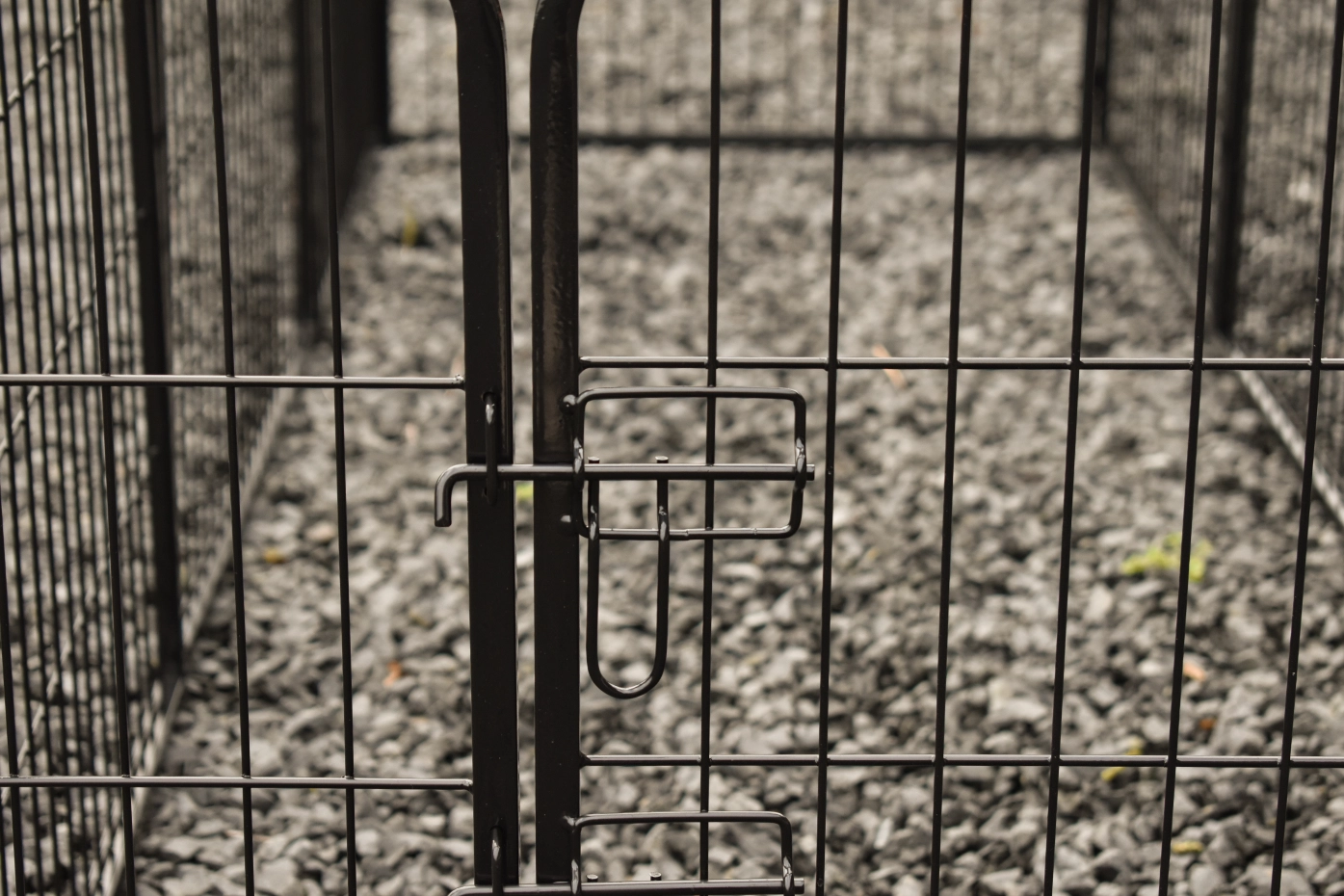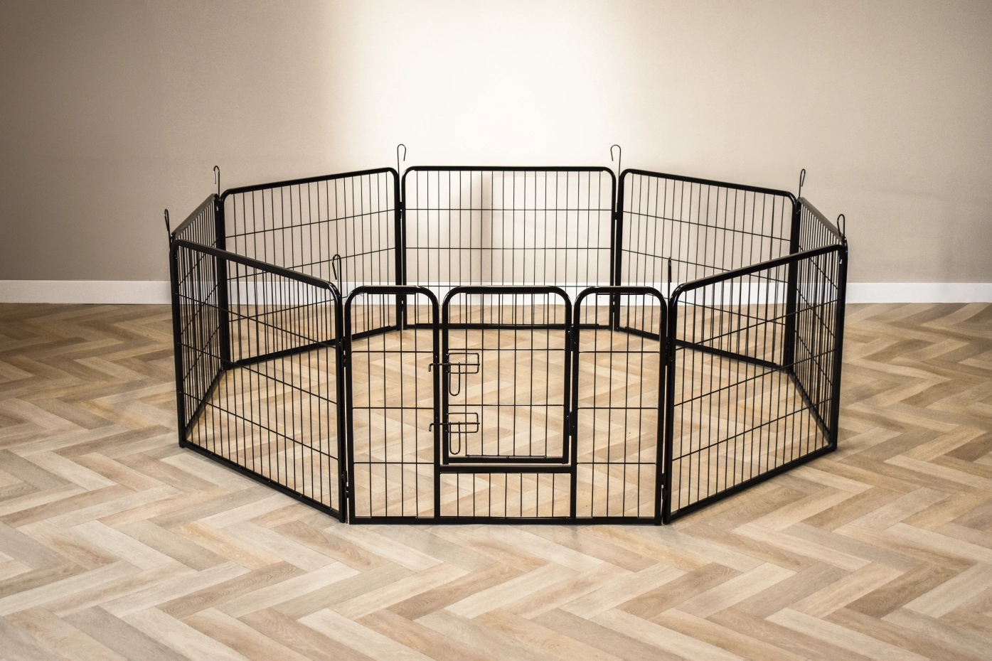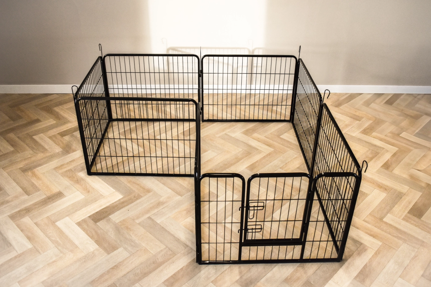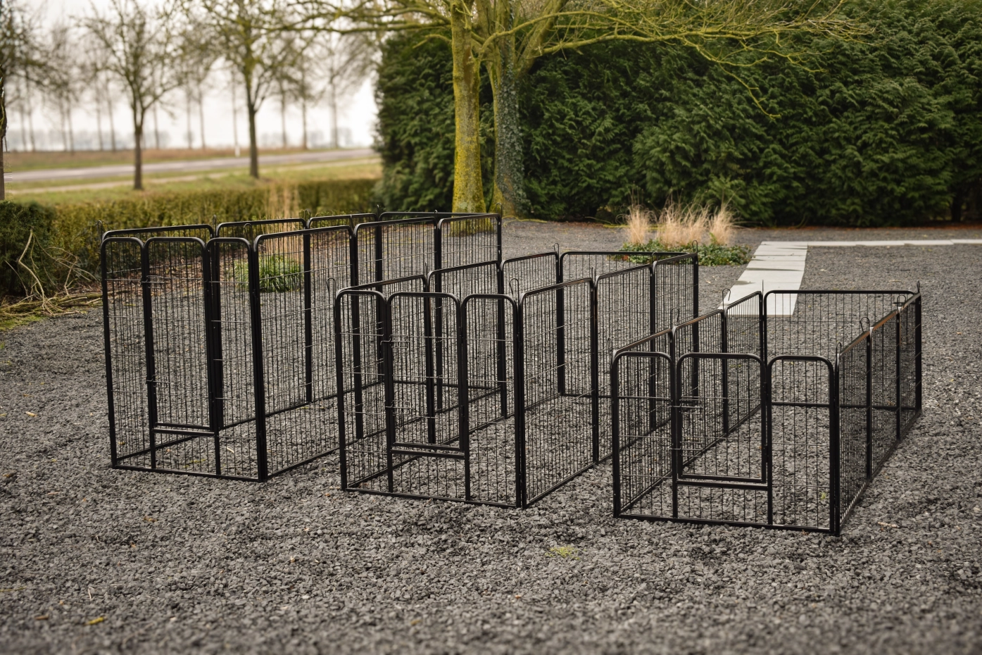 The puppy enclosure Octa exists of 8 panels and is made of powdercoated steel. The height of the run is 60cm. The run can be (de)mounted very easily.