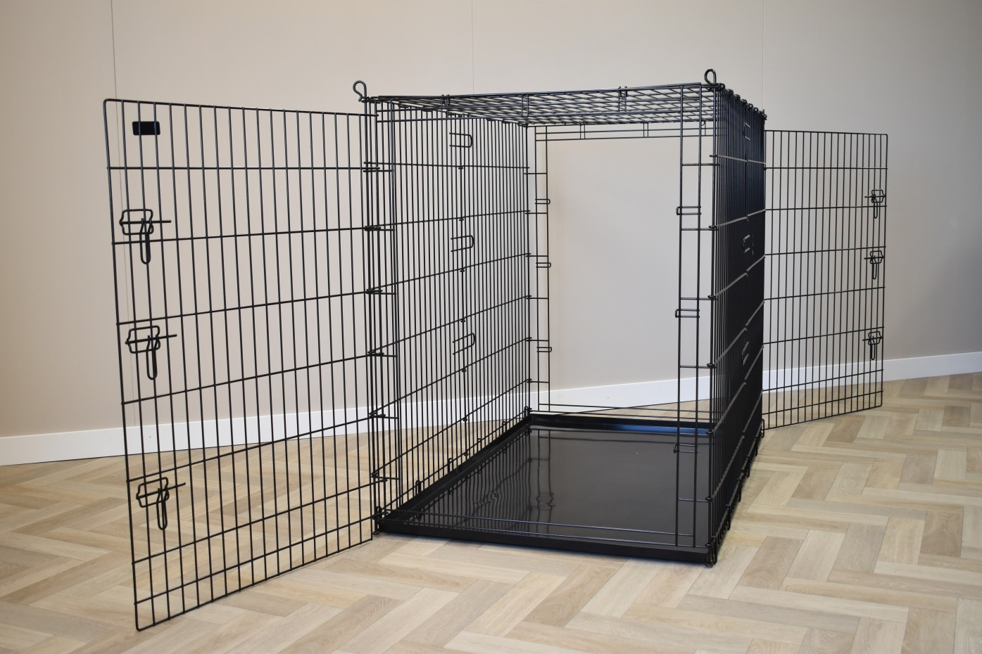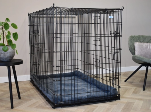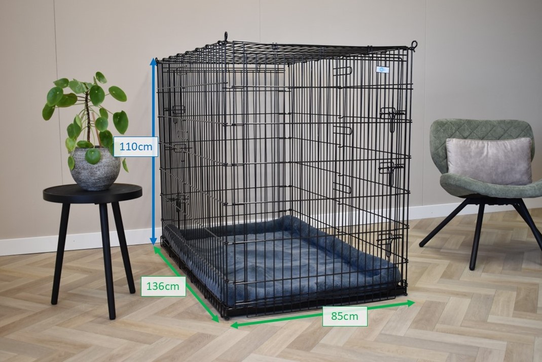 This extra large dog crate of no less than 136x85x110cm (LxWxH) is a huge dog crate. Even the largest dog will fit in this wire cage. This large XXL dog kennel is provided with 2 doors with solid, 3-double closures.