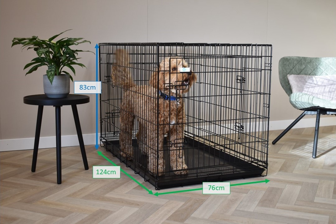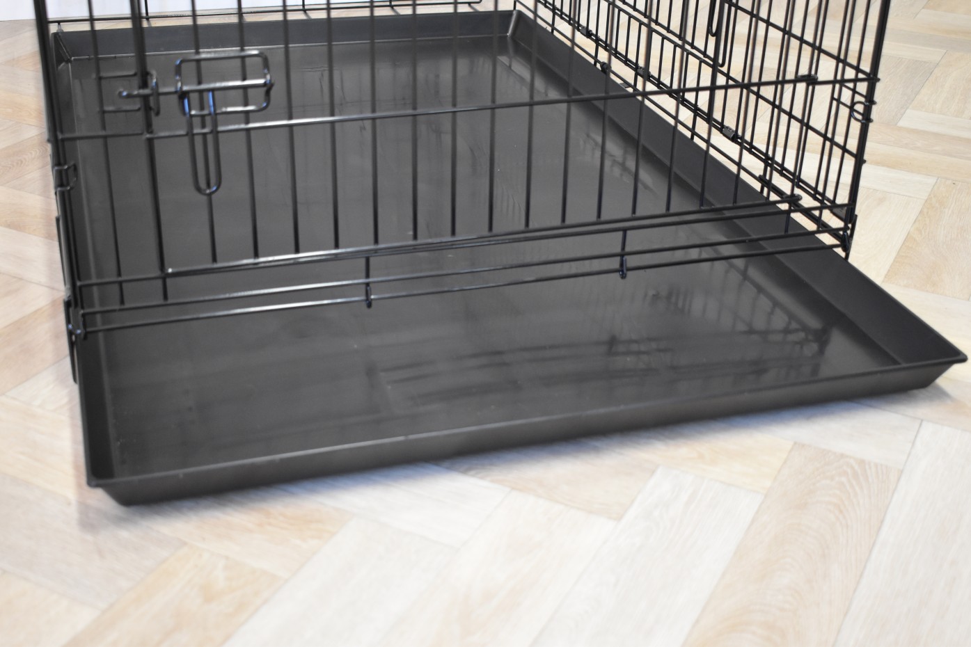 Large dog crate measuring 124x76cm with a height of 83cm. A sturdy dog crate with thick, black powder-coated bars. The crate has 3 sturdy doors with special double locks. This large, foldable dog crate also features rubber anti-slip feet and a sturdy, removable plastic tray. Our dog crate is suitable for large dogs: Alaskan Malamute, Bobtail, Bouvier, Bullmastiff, Doberman Pinscher, German Shepherd, Egyptian Pharaoh Hound, Rottweiler, Czechoslovakian Wolfdog, Swiss Shepherd, and Swiss Mountain Dog. Crate available in 7 different sizes: 48cm / 63cm / 78cm / 93cm / 109cm / [124cm] / 136cm.
