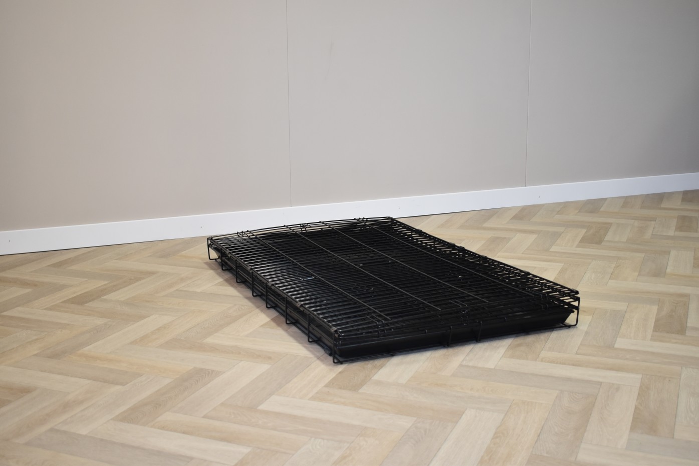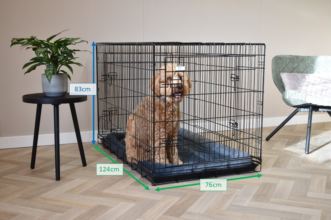 Large dog crate measuring 124x76cm with a height of 83cm. A sturdy dog crate with thick, black powder-coated bars. The crate has 3 sturdy doors with special double locks. This large, foldable dog crate also features rubber anti-slip feet and a sturdy, removable plastic tray. Our dog crate is suitable for large dogs: Alaskan Malamute, Bobtail, Bouvier, Bullmastiff, Doberman Pinscher, German Shepherd, Egyptian Pharaoh Hound, Rottweiler, Czechoslovakian Wolfdog, Swiss Shepherd, and Swiss Mountain Dog. Crate available in 7 different sizes: 48cm / 63cm / 78cm / 93cm / 109cm / [124cm] / 136cm.