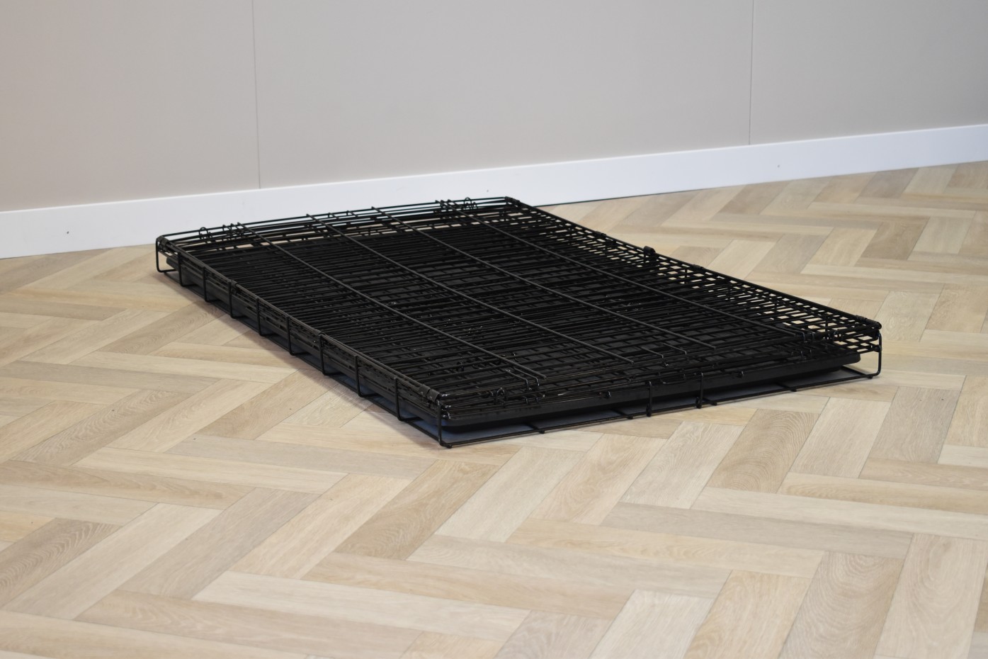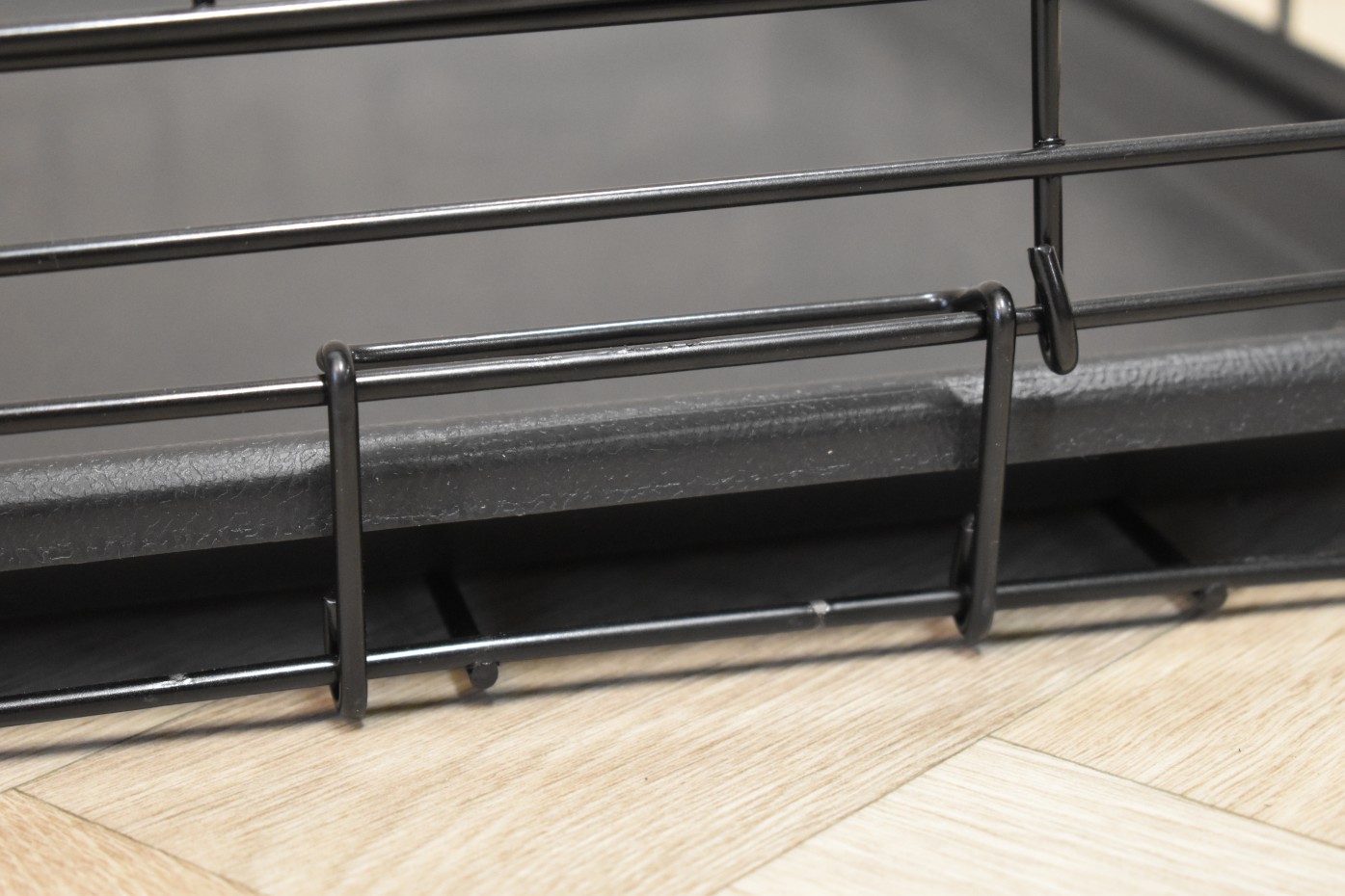 - Solid dog crate with black-coated bars