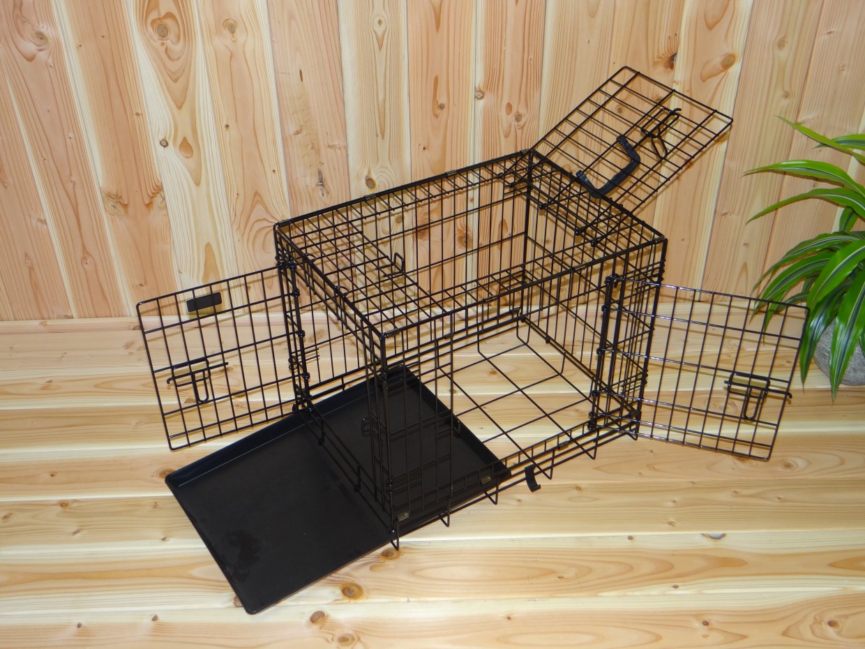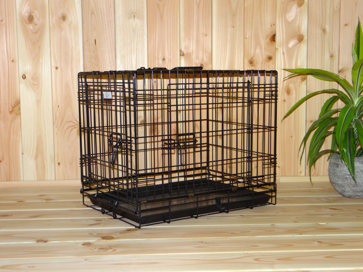 Sturdy, black dog crate with 3 doors. The dimensions of this dog crate are 63x45x52cm. This wire cage with sturdy, thick, black powder-coated bars has 3 sturdy doors with special slide locks. A convenient, foldable dog crate equipped with rubber anti-slip feet and a removable plastic tray. Suitable as a crate for smaller dogs like Boomer, Cavalier King Charles Spaniel, Pomeranian, Maltese, Pekingese, Dachshund, West Highland White Terrier, and Yorkshire Terrier. Our strong, black dog crate is available in 7 different sizes: 48cm / [63cm] / 78cm / 93cm / 109cm / 124cm / 136cm.