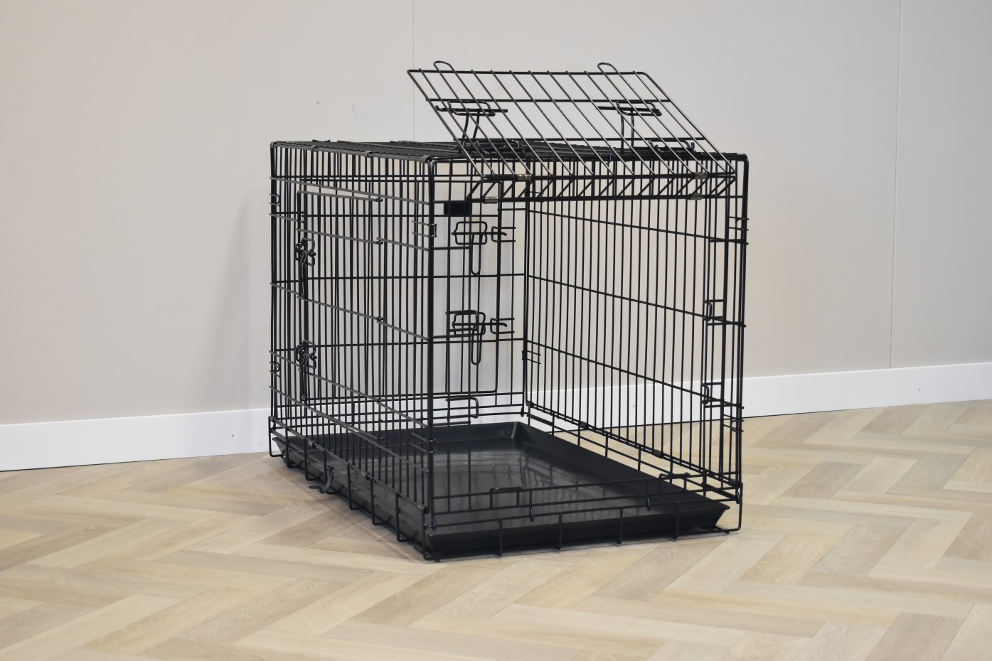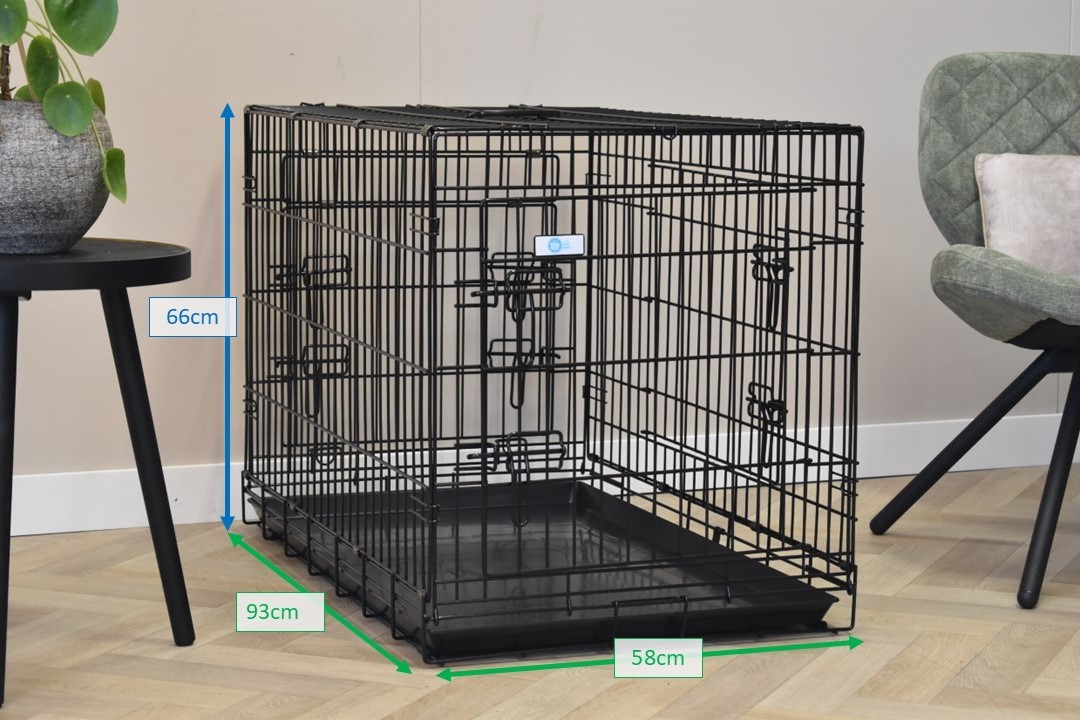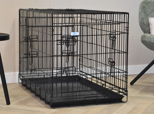 This solid dog cage Strong 93cm is provided with 3 doors. This cage has thick, black powdercoated bars. The cage can be folded very easily. Because of the handle you can carry it very easily. Because of the removable plastic tray you can clean the cage very easily. The medium-sized dog crate is suitable for dogs like: American Staffordshire Terrier, Bulldog, Chow Chow, Cocker Spaniel, English Setter, English Springer Spaniel, Labradoodle, Pit Bull Terrier, Samoyed, Shar Pei, and Siberian Husky. The solid cage is available in 7 different sizes: 48cm / 63cm / 78cm / [93cm] / 109cm / 124cm / 136cm.