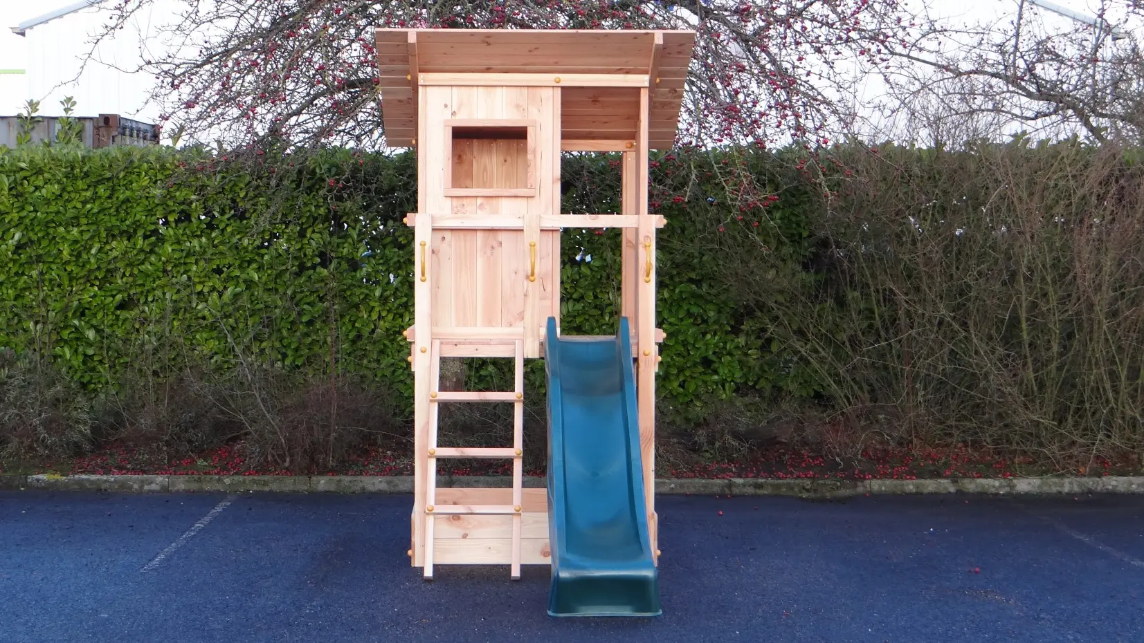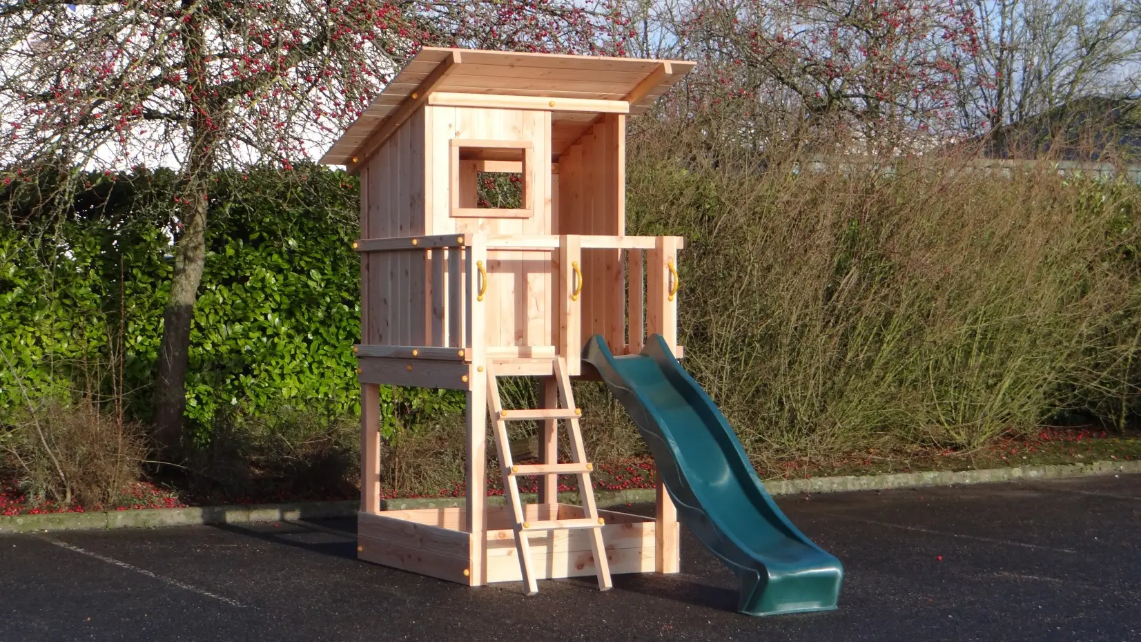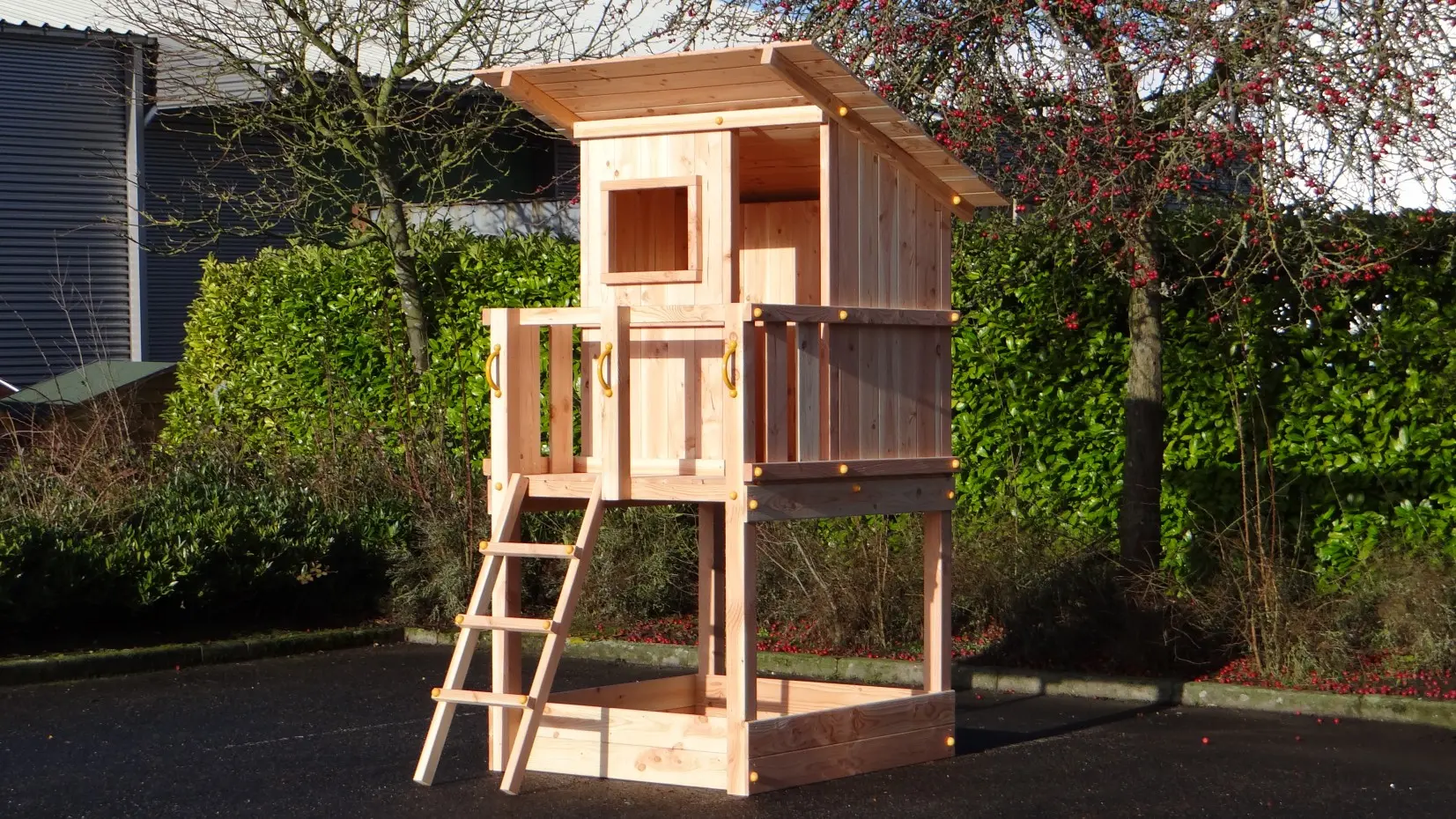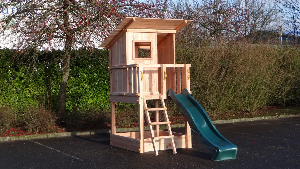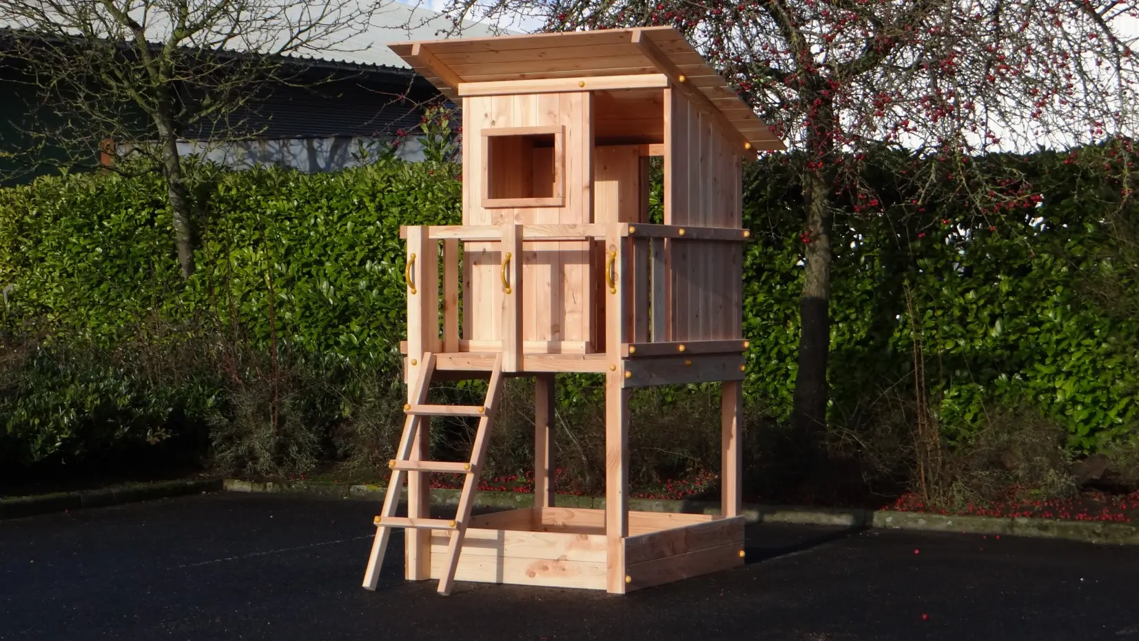 The playtower Beach Hut Low made of Douglas wood is a beautiful and incredibly fun play tower. As the name suggests, the Beach Hut Low is a low play tower. Nevertheless, the play equipment Beach Hut offers many play possibilities. This low wooden play tower for outdoors is also very suitable for little ones. Children can play in it, on it, off it, and wonderfully underneath, so they can never get enough of it. There is a third opening at the back of the house. An additional attachment element can be added here, such as a climbing wall with rope (@ramp), a climbing wall with climbing stones (@wall), stairs (@steps), or a connecting bridge with climbing net (@bridge).