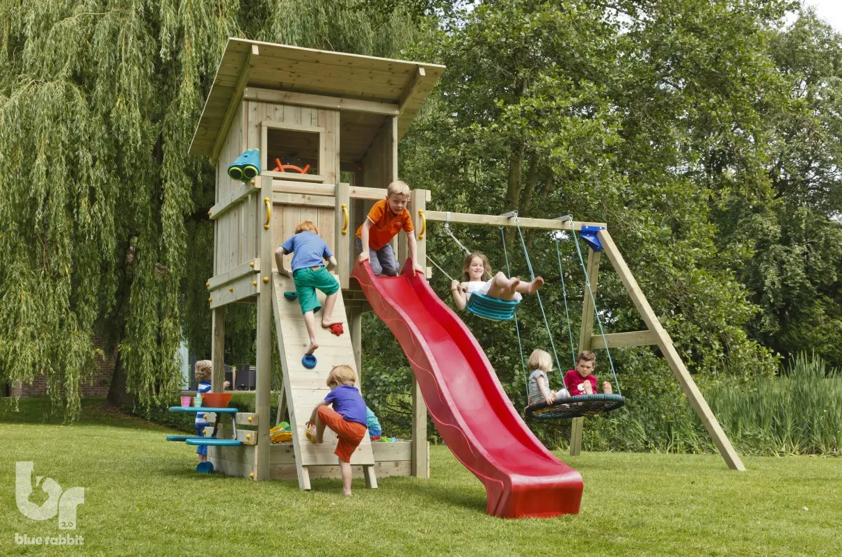 The Beach Hut has 3 openings. One for the ladder, one for a slide. At the third opening, an additional element can be easily attached, such as a climbing wall or climbing net.