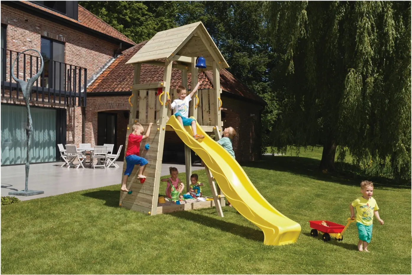 Enjoy expansive views from this Belvedere play tower! This tower is particularly suitable for smaller gardens as both the slide and the ladder are located at the front. The sloping side walls and the integrated, wide climbing wall give this tower its distinctive appearance. The platform height of this tower is 120cm.