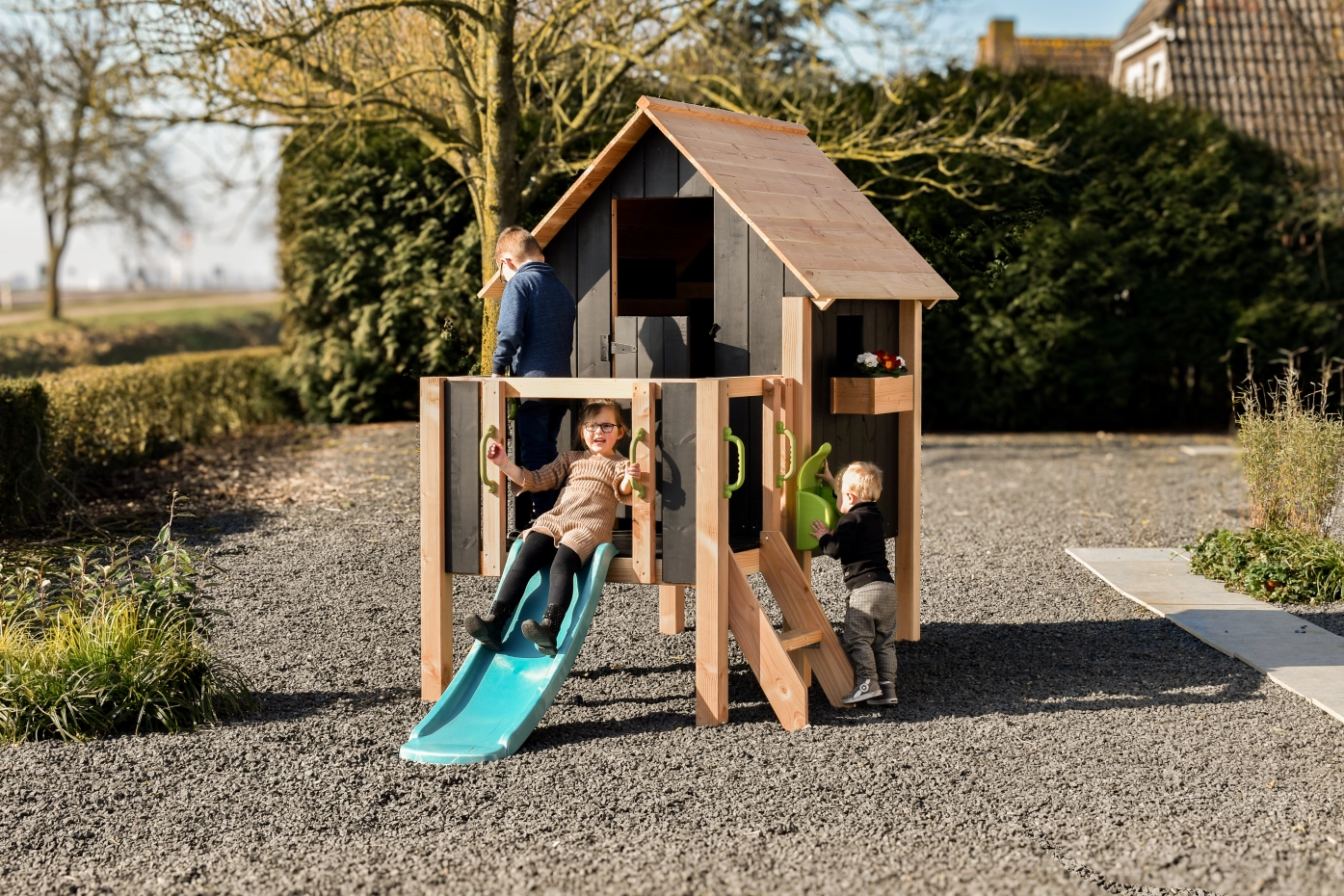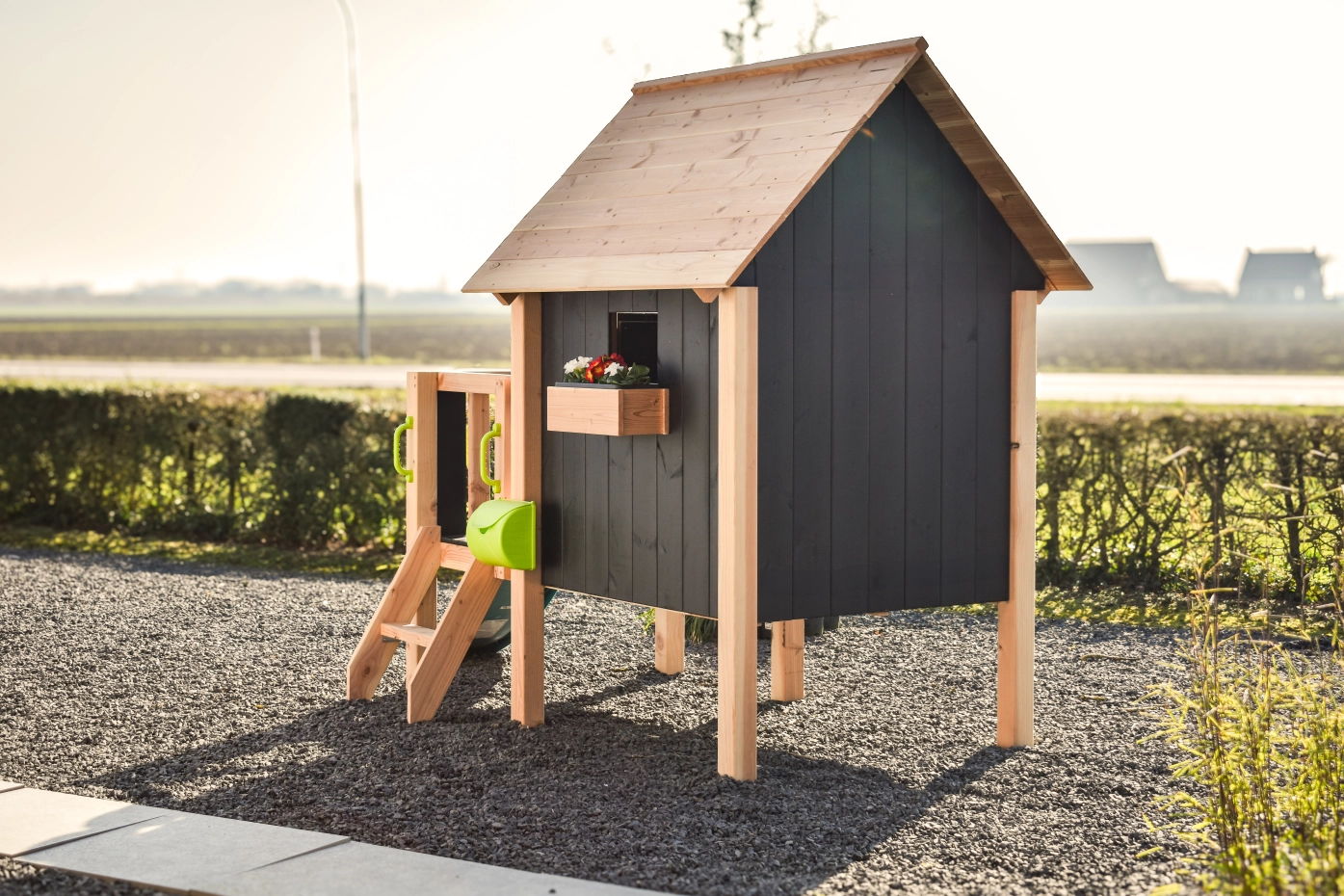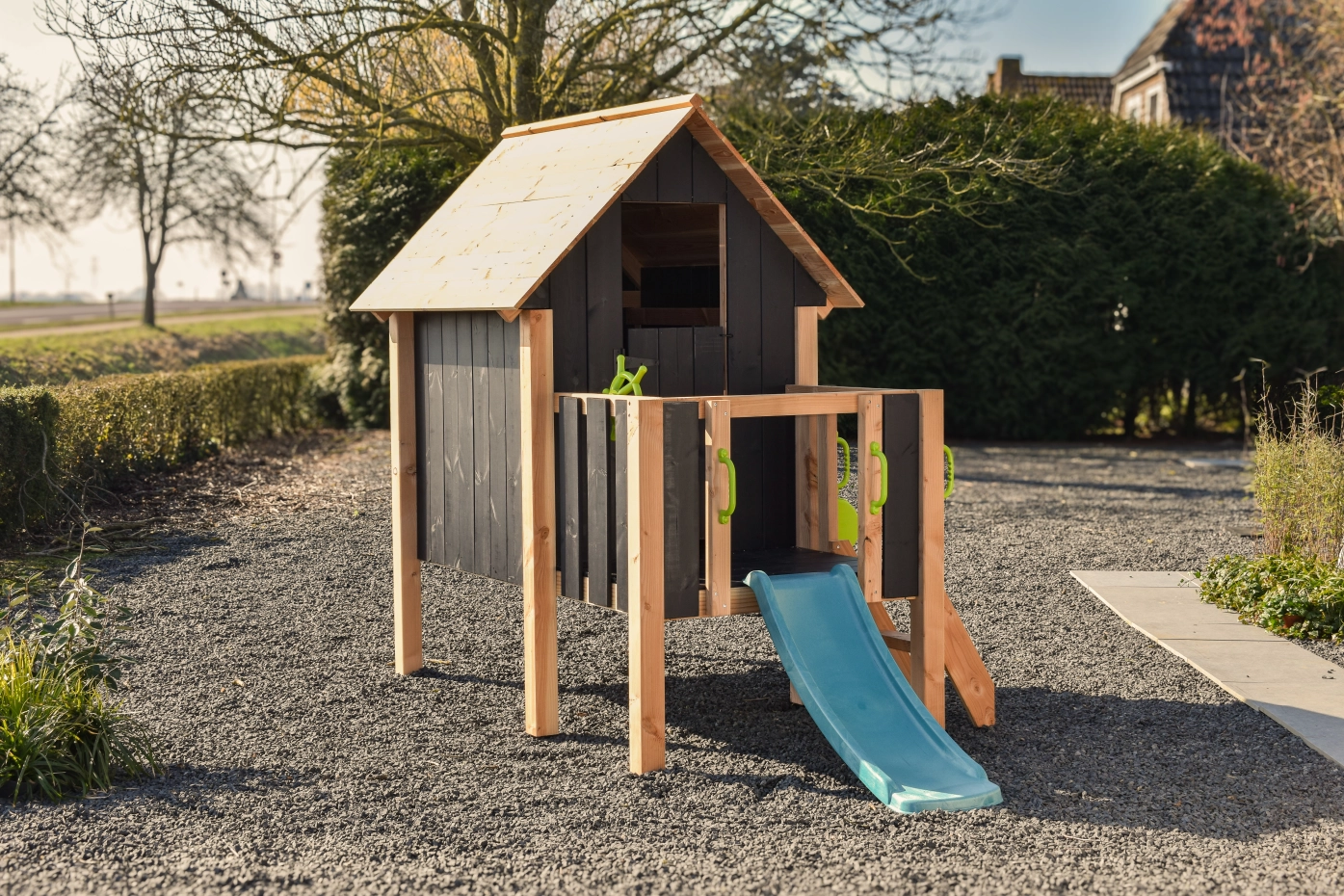 Playhouse Dream 60 is a cosy and sturdy playhouse with a platform height of 60 cm – low to the ground, yet with a fun slide for endless play.