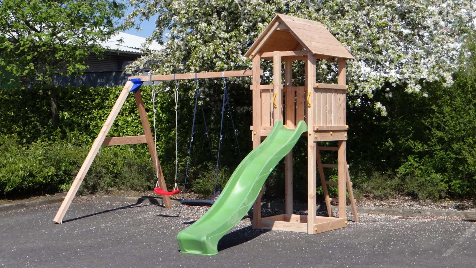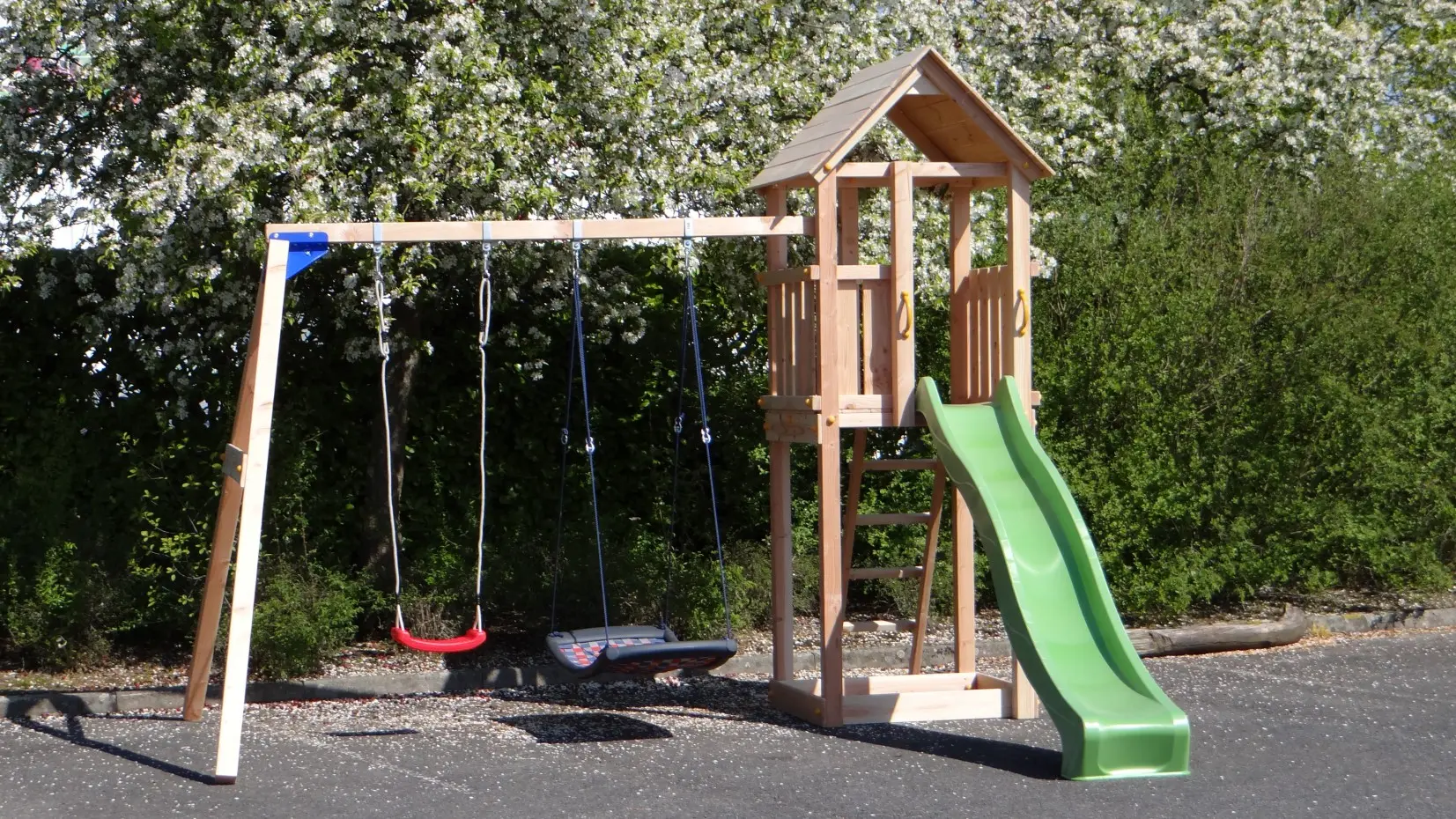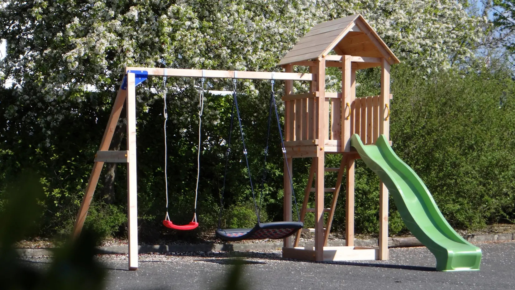 The Kiosk playset made of Douglas wood with slide and swing attachment is a beautiful, durable play tower that can be set up compactly and fits perfectly in today's gardens! Durable Douglas wood is increasingly used in gardens. It has a beautiful, flaming grain and can last easily 10-15 years untreated. However, it quickly grays due to the sun. You can protect it with stain or Douglas oil.