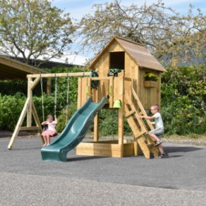The Dream 120 playhouse is every child's dream who loves playing outdoors. This closed playhouse has a platform at a height of 120 cm, keeping you high and dry. The Dream playhouse includes a long slide of 230 cm. Additionally, it features a double swing, suitable for two swing seats or one nest swing. The child-friendly ladder has flat steps and comes with 2 handrails. The space underneath the playhouse can be used for a sandbox or for neatly storing loose toys.