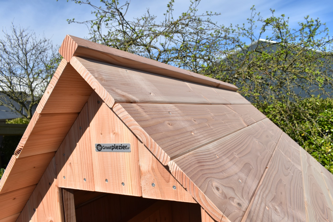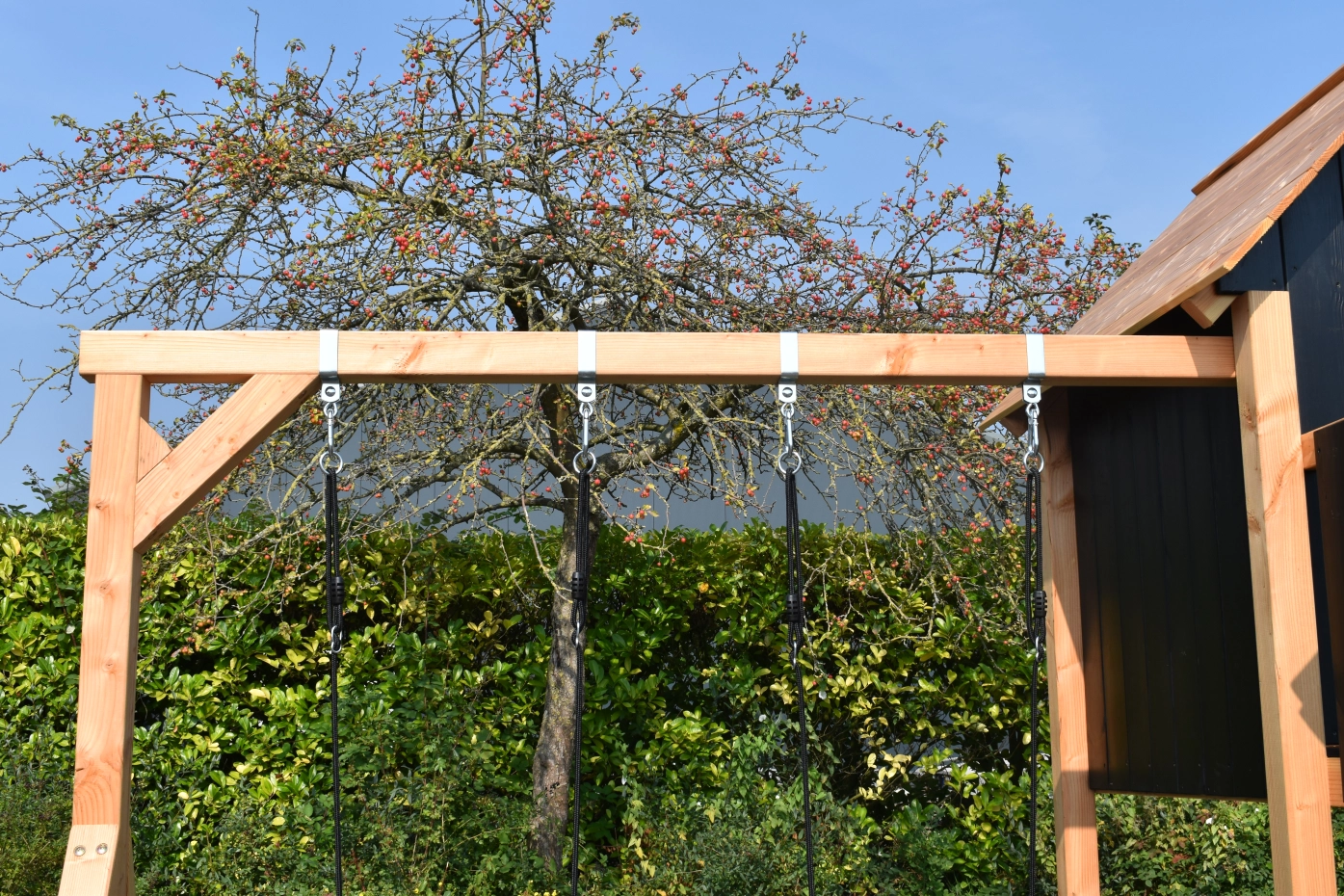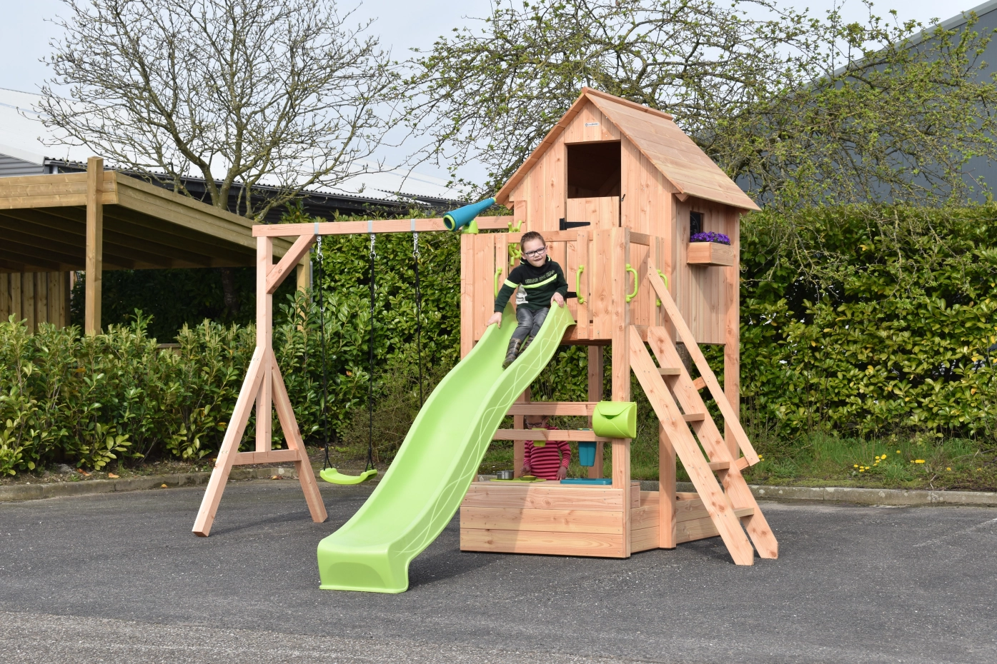 The playhouse Dream 150 is every child’s dream for outdoor play. This enclosed playhouse features a platform at 150 cm high, keeping kids high and dry while enjoying an extra-long slide. Note: the slide consists of 3 parts. Additionally, the playhouse includes a double swing, suitable for 2 swing seats or 1 nest swing. The child-friendly ladder has flat steps and 2 handrails.