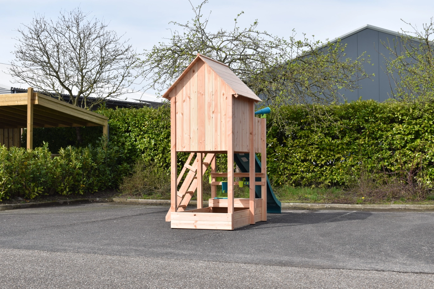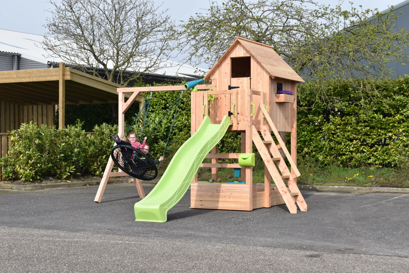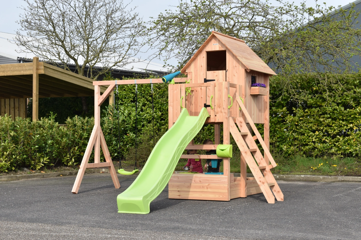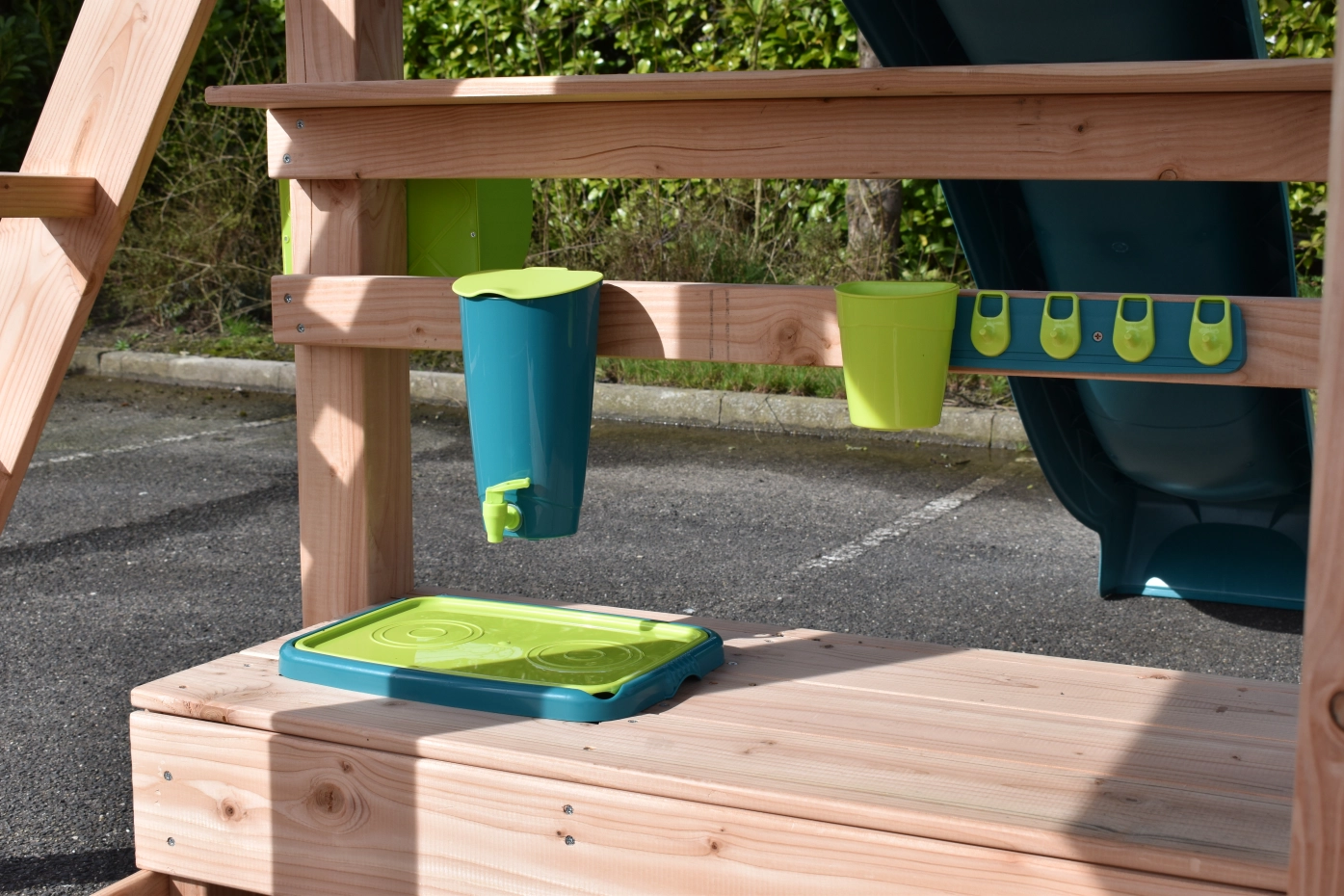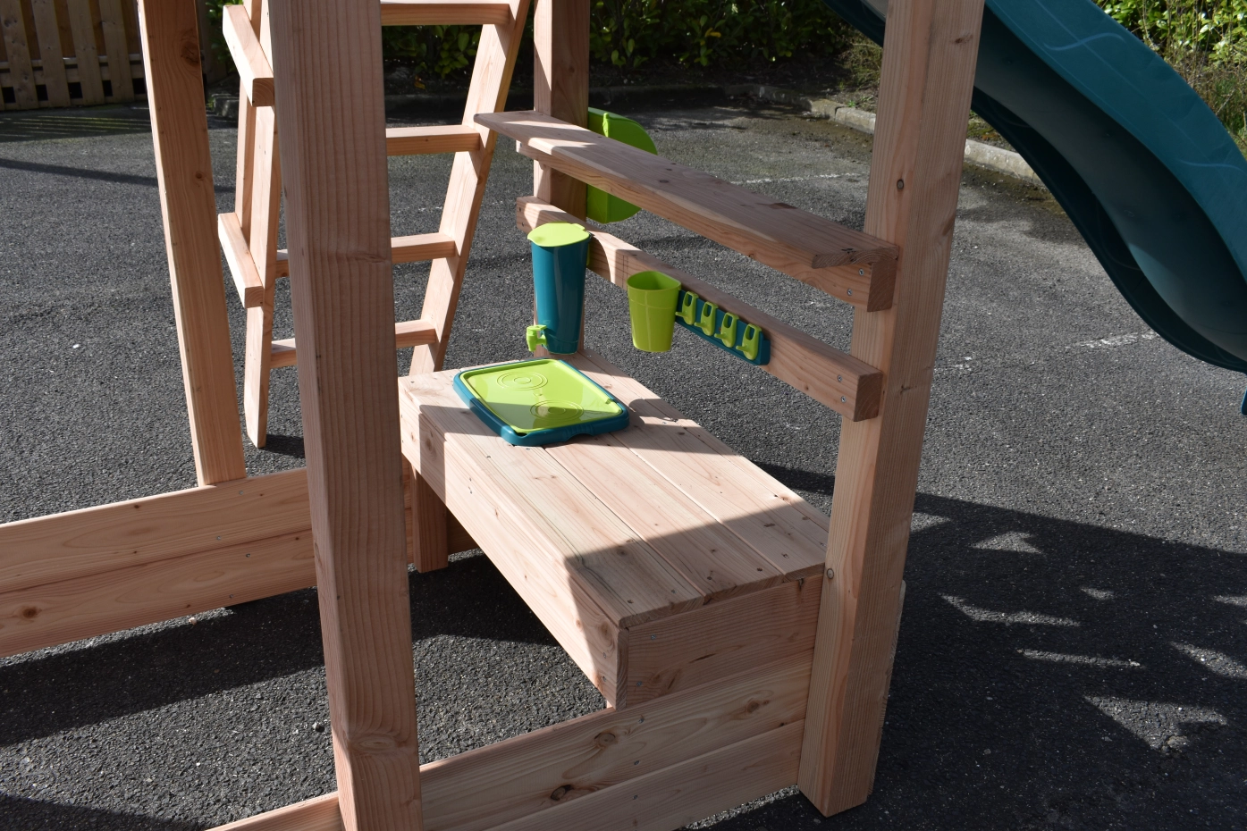 The mud kitchen underneath the playhouse adds extra fun and play challenges!