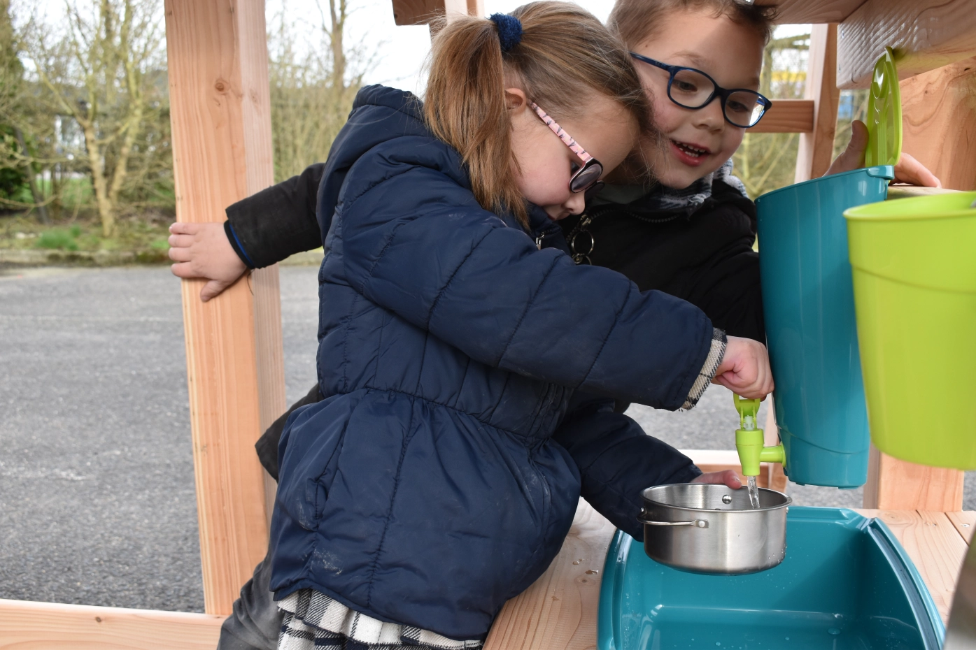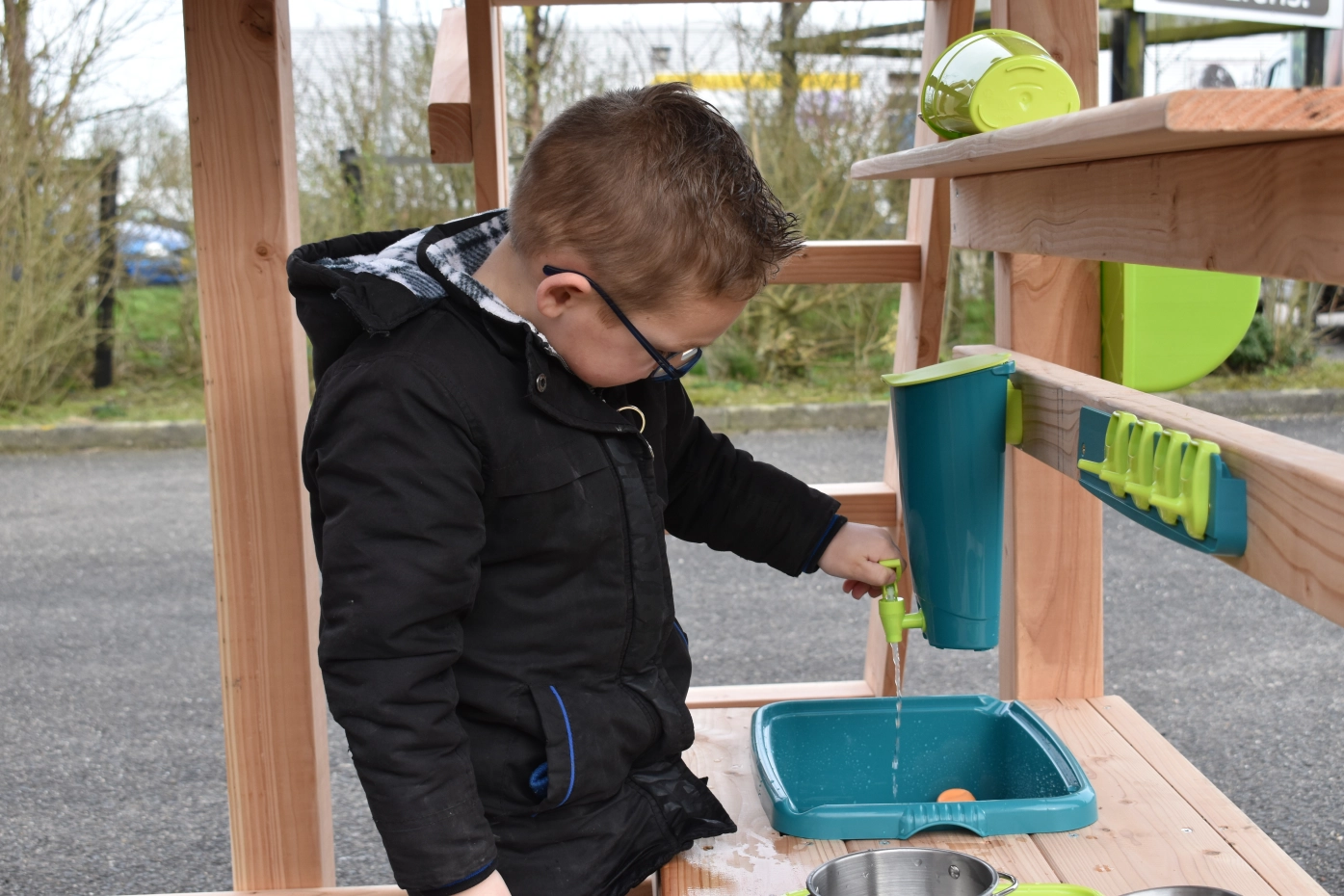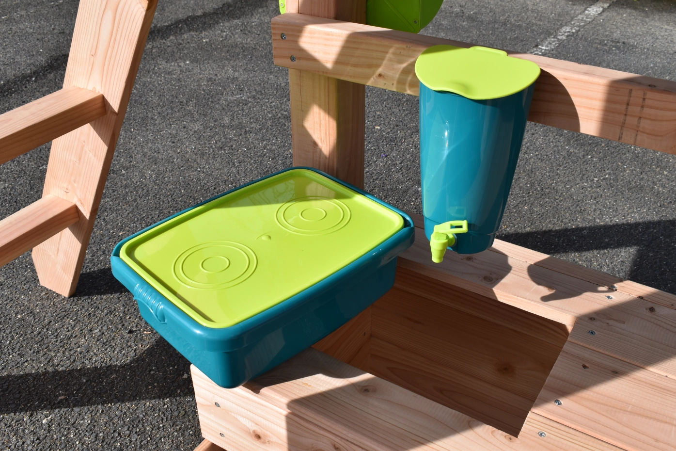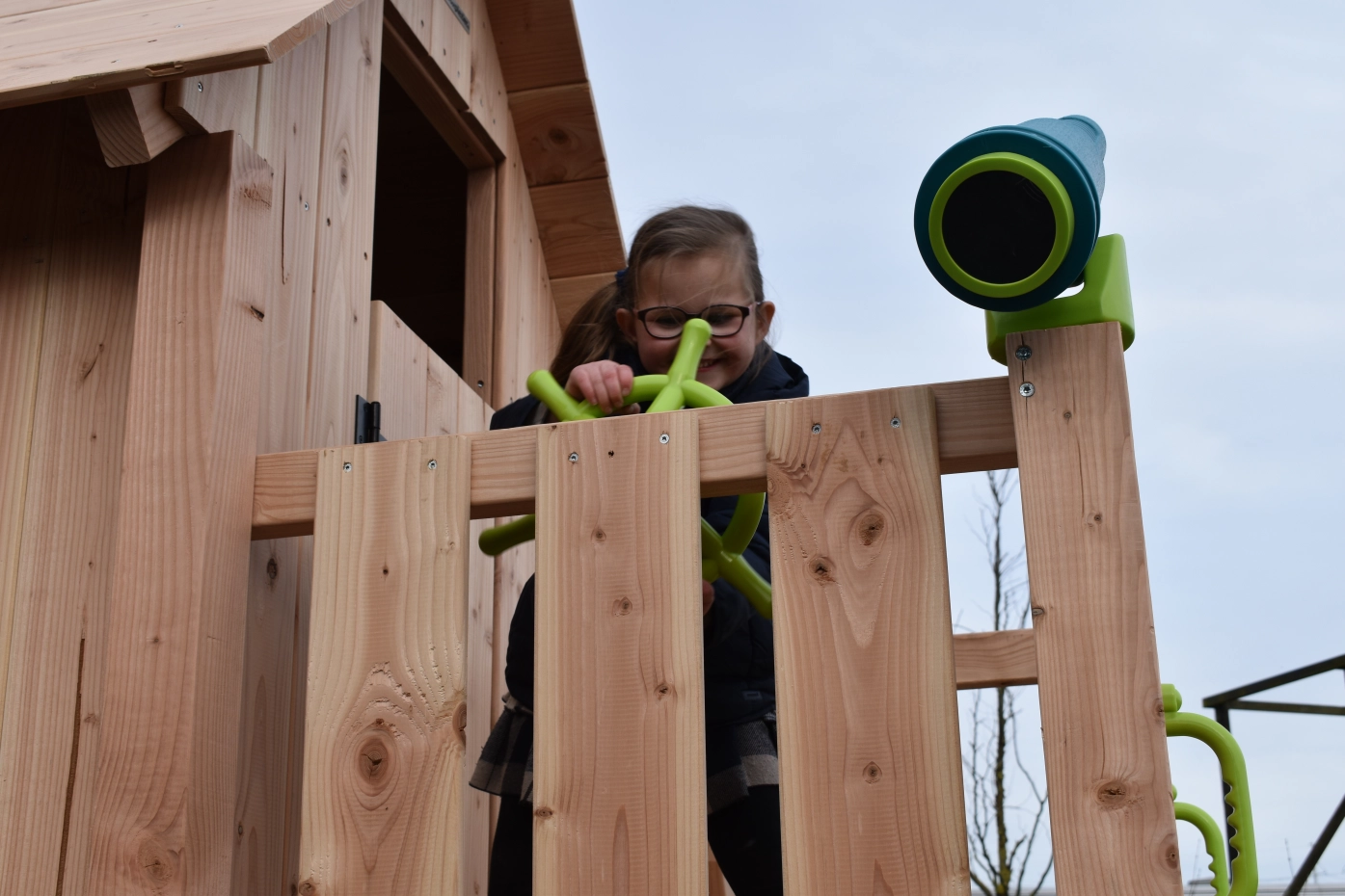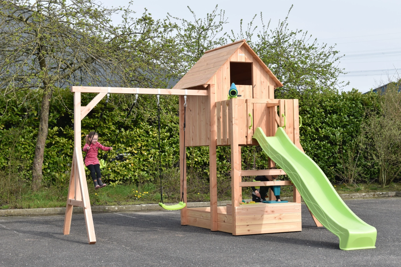 The mud kitchen underneath the playhouse adds extra fun and play challenges!