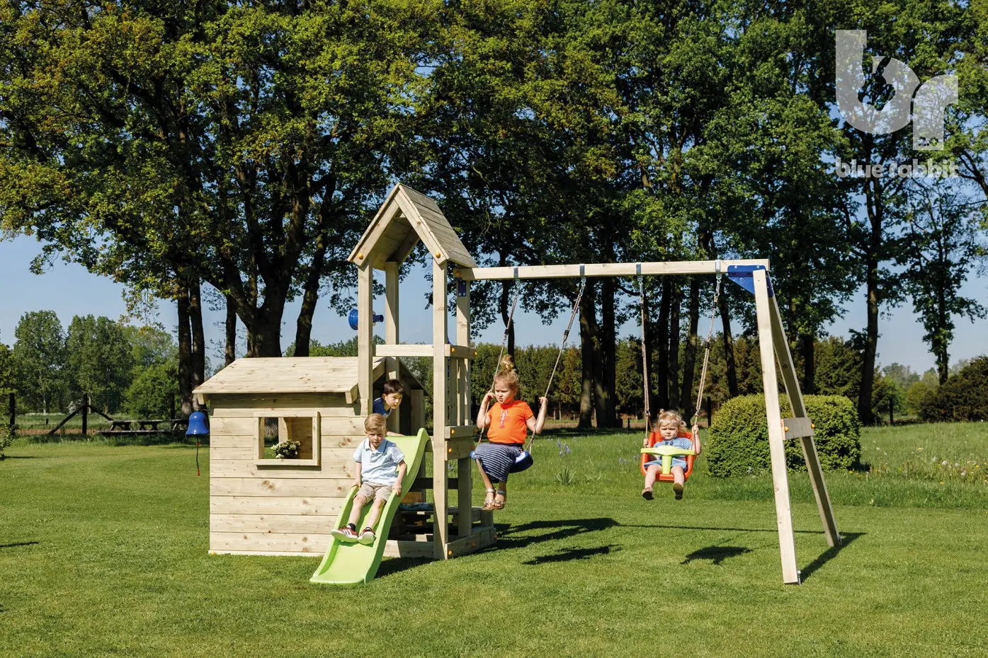 The Blue Rabbit Lookout is a multifunctional play tower with a playhouse and a swing! The platform for the slide has a height of 90cm and is accessible from different sides. This playhouse is ideal for hiding in or lounging around and even has a door with a magnetic lock. On the side, you'll find a counter for playing shop and other games. Your children will instantly fall in love with the cute Blue Rabbit Lookout and its many play possibilities.