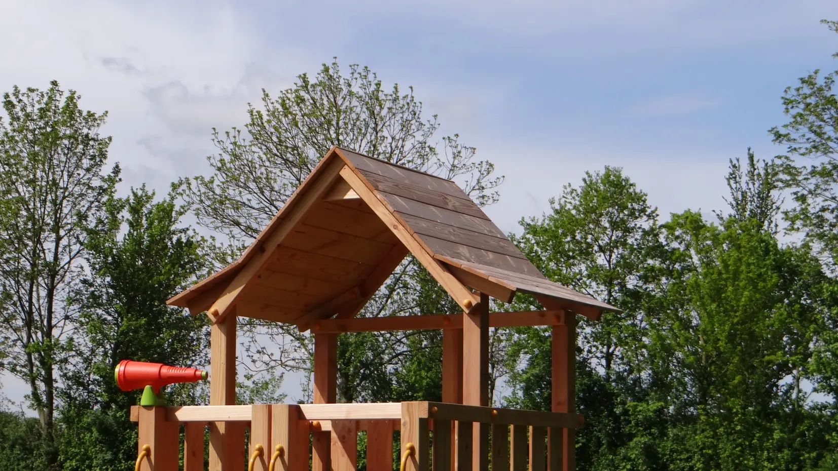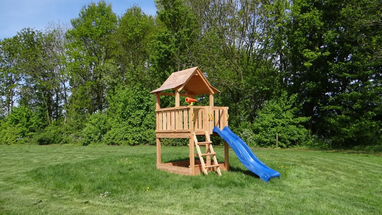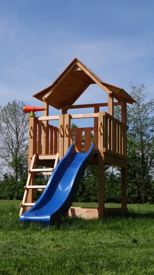 The Pagoda play tower is made from high-quality Douglas fir wood. It features a large playhouse with three exits at the top. Equipped with two small stairs and a slide, it also offers the option to add extra elements. The expansive play area includes a covered section with a delightfully playful wooden roof.