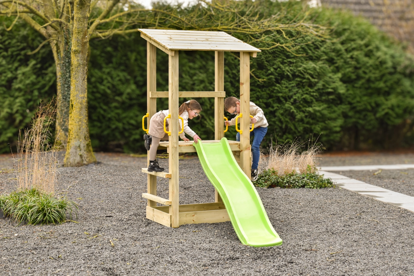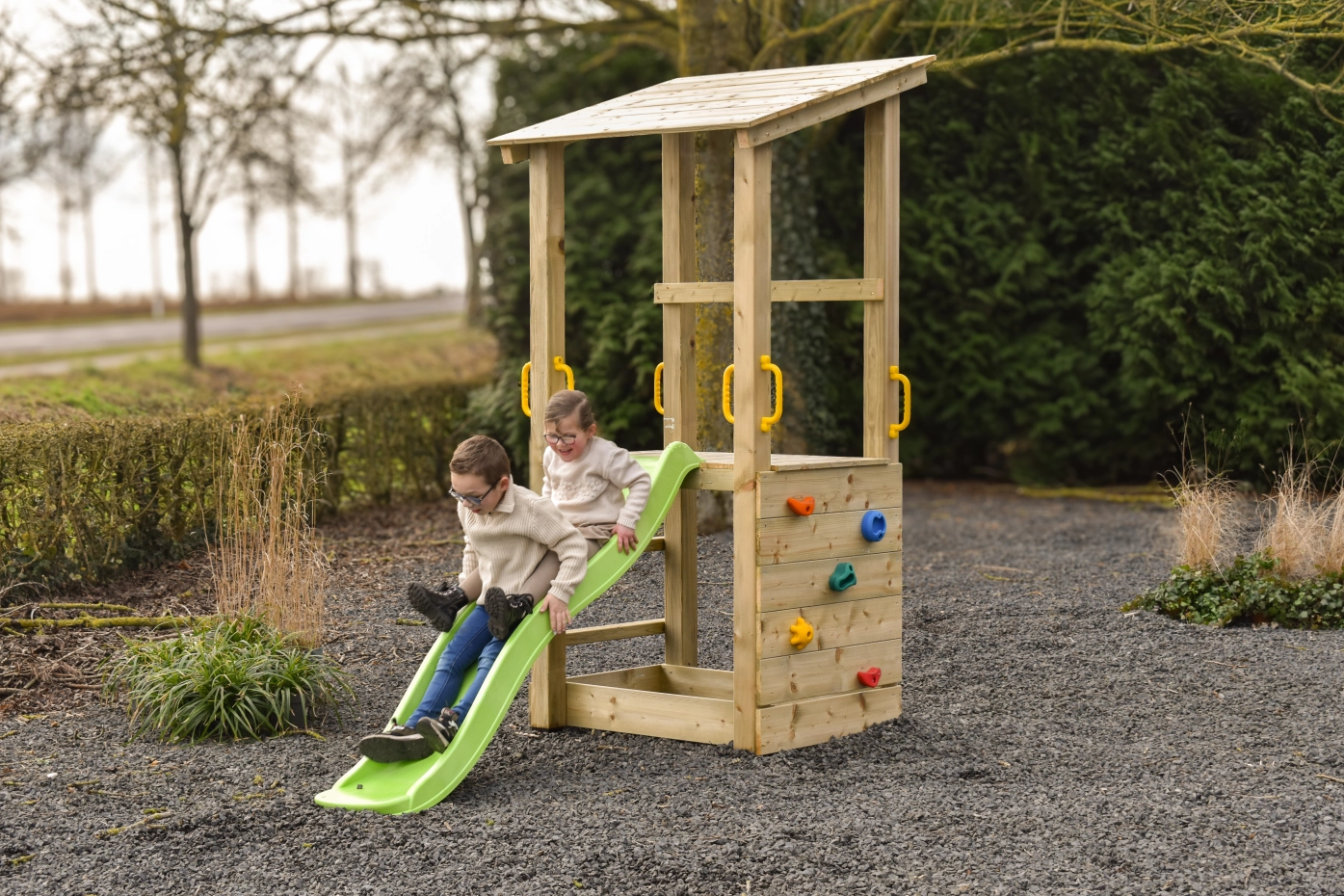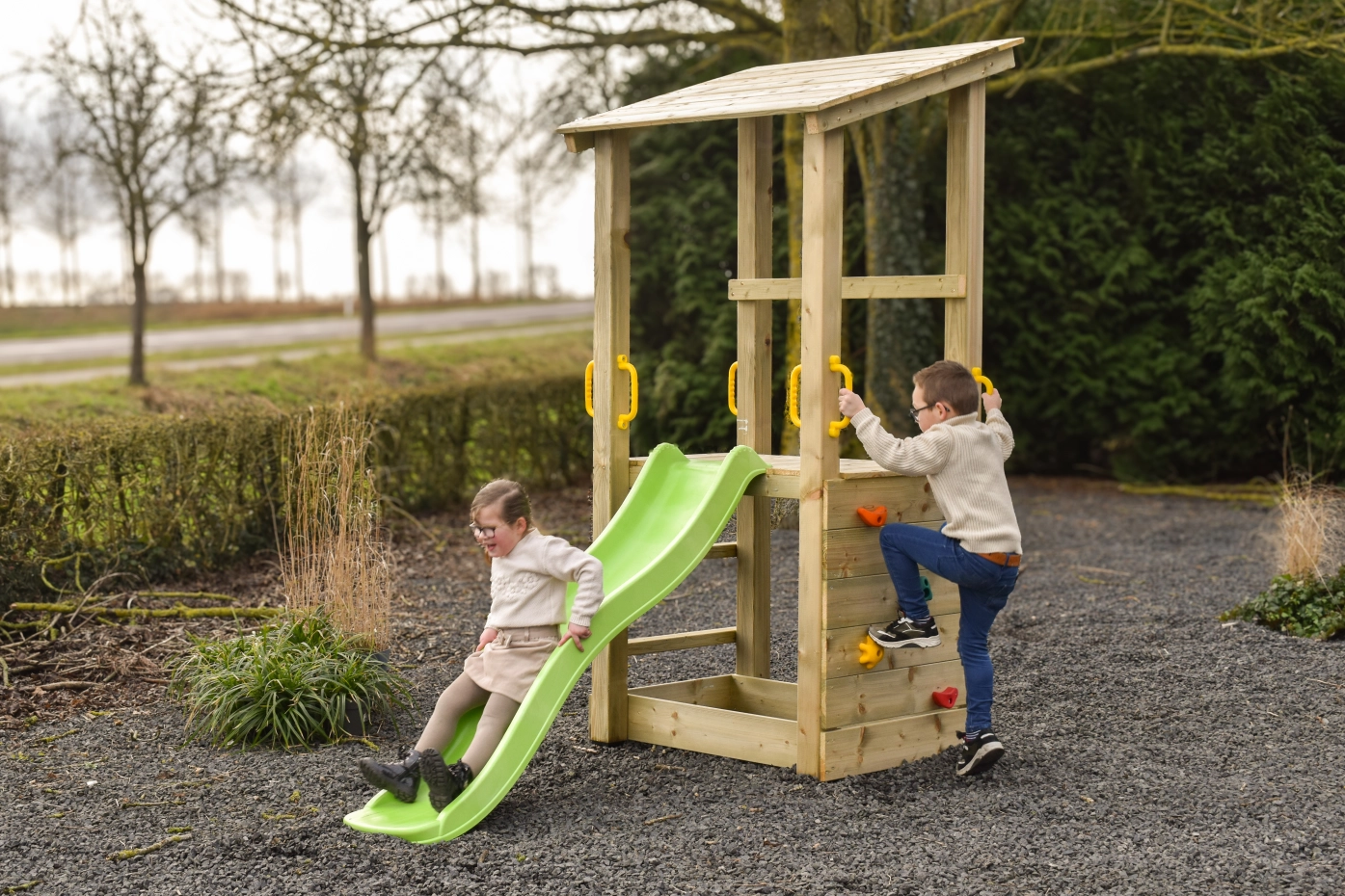 The wooden playhouse Plan 90 guarantees hours of fun for adventurous children. With its sturdy construction made from pressure-treated wood, Plan 90 offers a safe and durable play space in the garden. The slide provides a joyful, quick descent, while the climbing wall with colorful grips challenges kids to climb up.