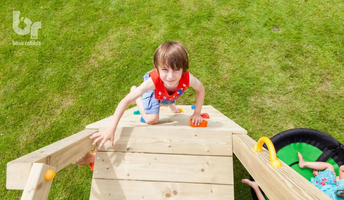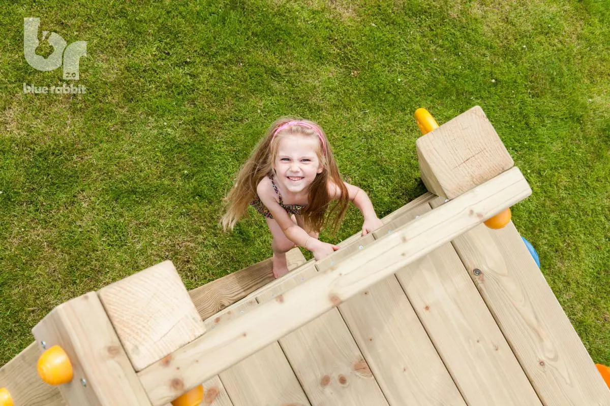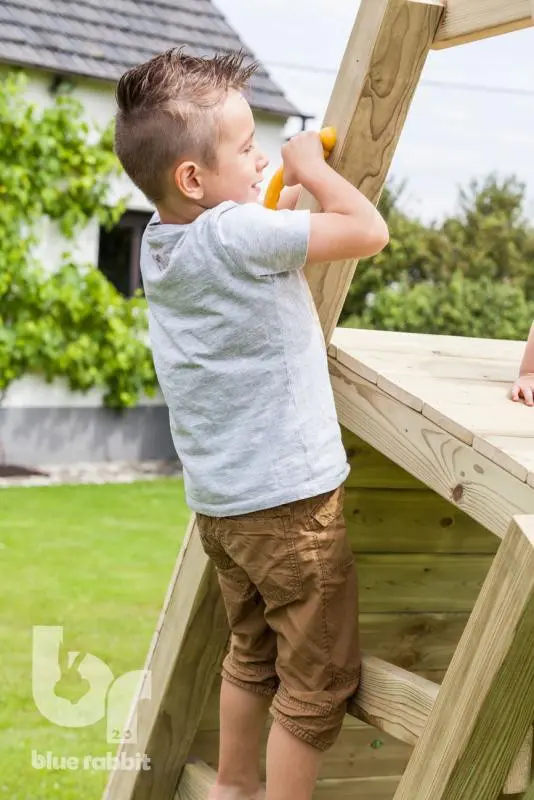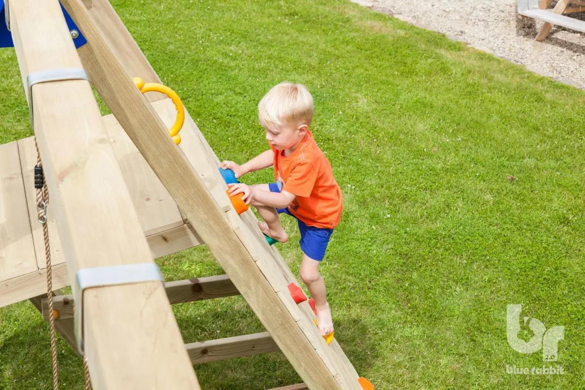 The extension element @Challenger Low is a great addition that can be used in many situations. A fantastic enhancement for your play equipment, or as a separate unit right against the wall! The @Challenger is fully equipped with a swing, climbing wall with climbing stones, a climbing net, and a small ladder! The @Challenger can be attached to play equipment with a platform height of 120 cm.