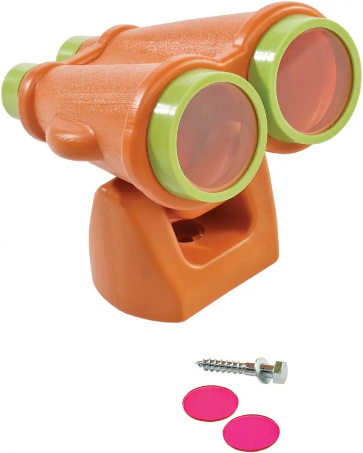 This fun orange binoculars feature lime green accents. A great accessory for play equipment, adding more fun and imagination. Includes 2 yellow and 2 pink lenses. Available in various colors.