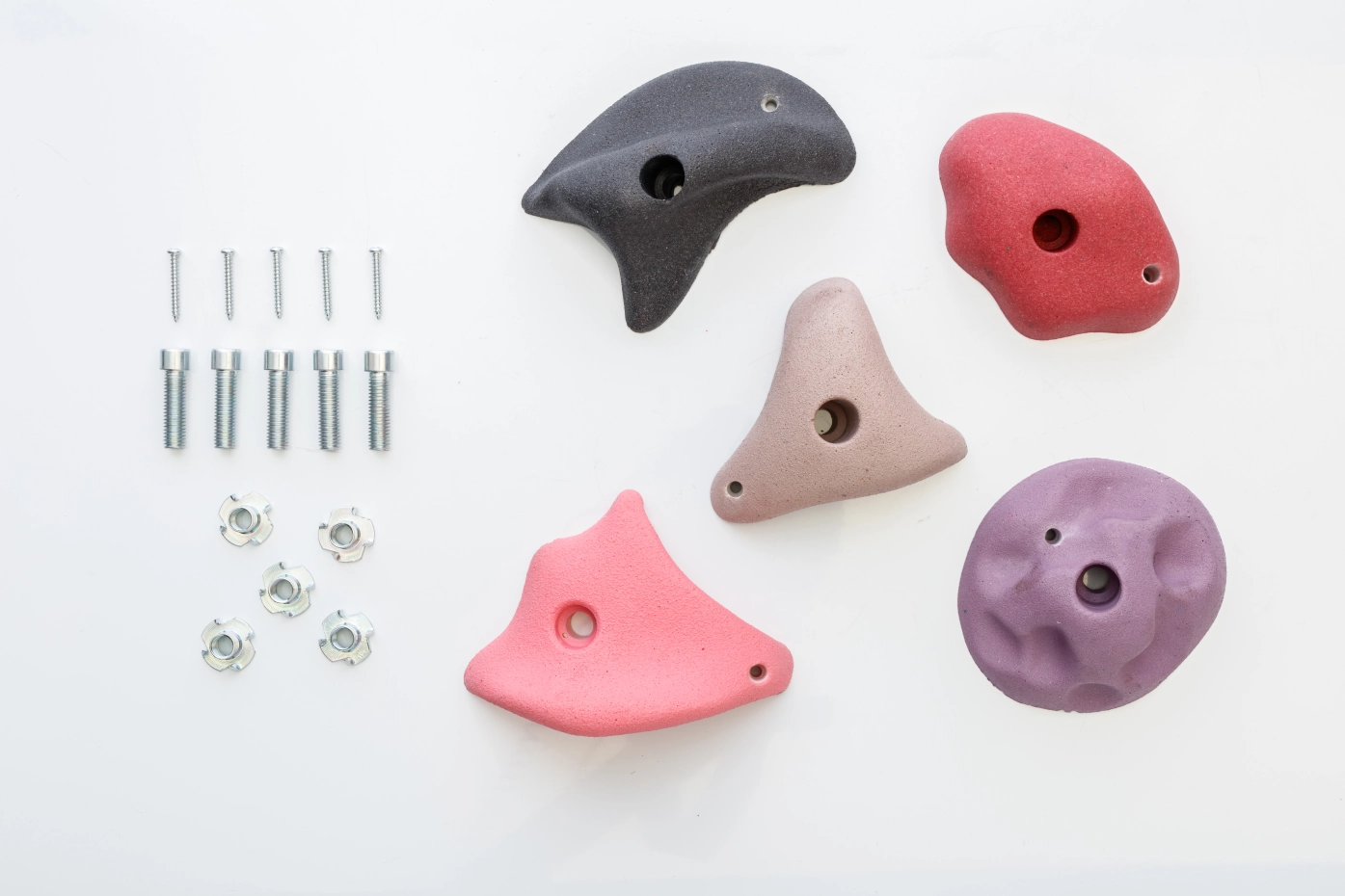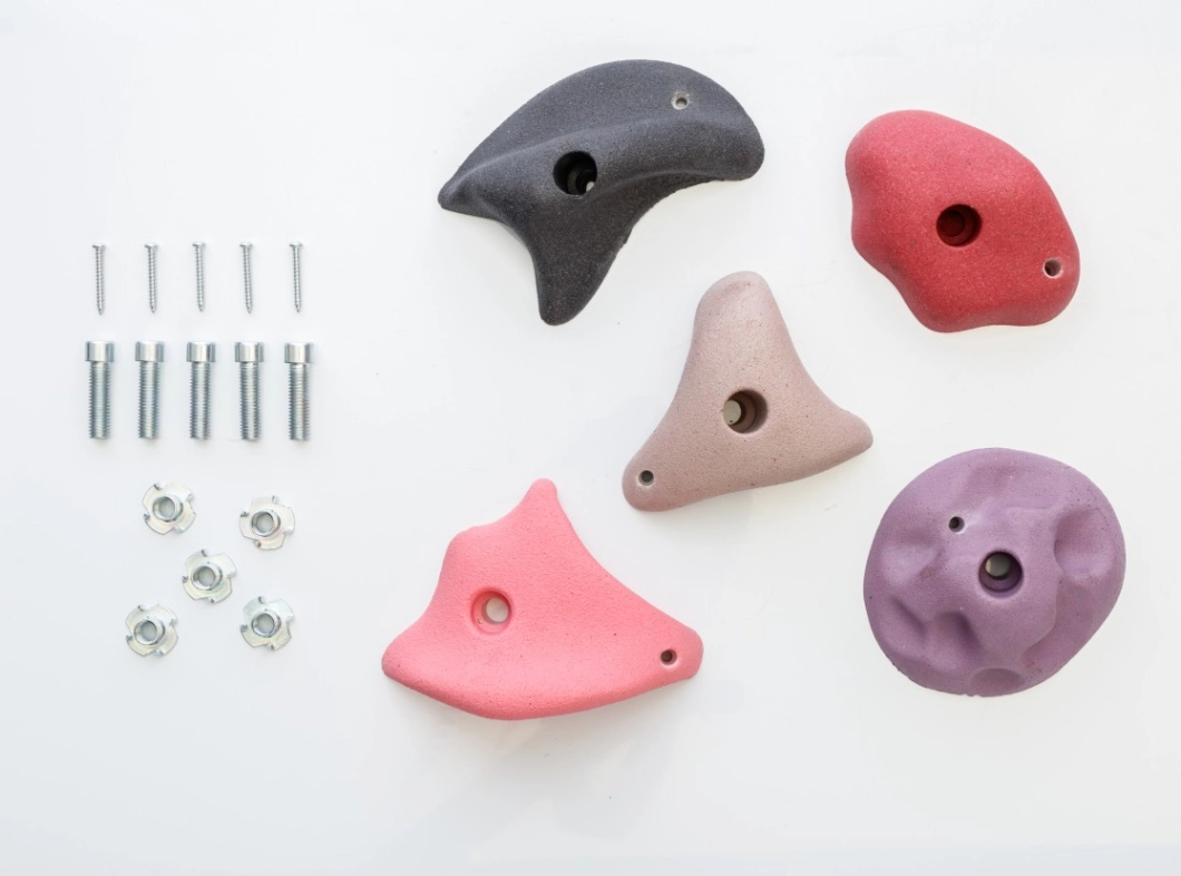 Create a safe and attractive climbing wall with this set of 5 high-quality climbing holds, each measuring 100–120 mm in diameter. Made of durable resin with integrated metal inserts, these holds offer excellent grip. The set comes complete with cylinder bolts (M10), T-nuts, and screws. Thanks to the double mounting points, the holds remain stable and rotation is prevented. Perfect for use on play equipment.