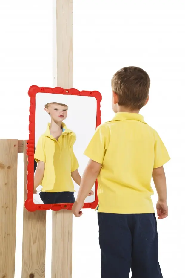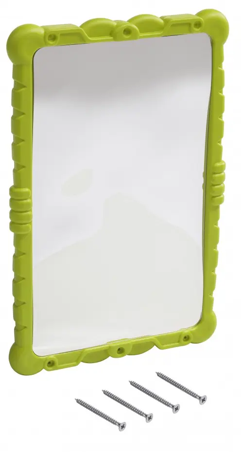 The lime green funhouse mirror is very funny. Its strange effects make looking into it (un)pleasant for everyone. The mirror is easy to mount on a play tower or playhouse. It can be mounted both horizontally and vertically.