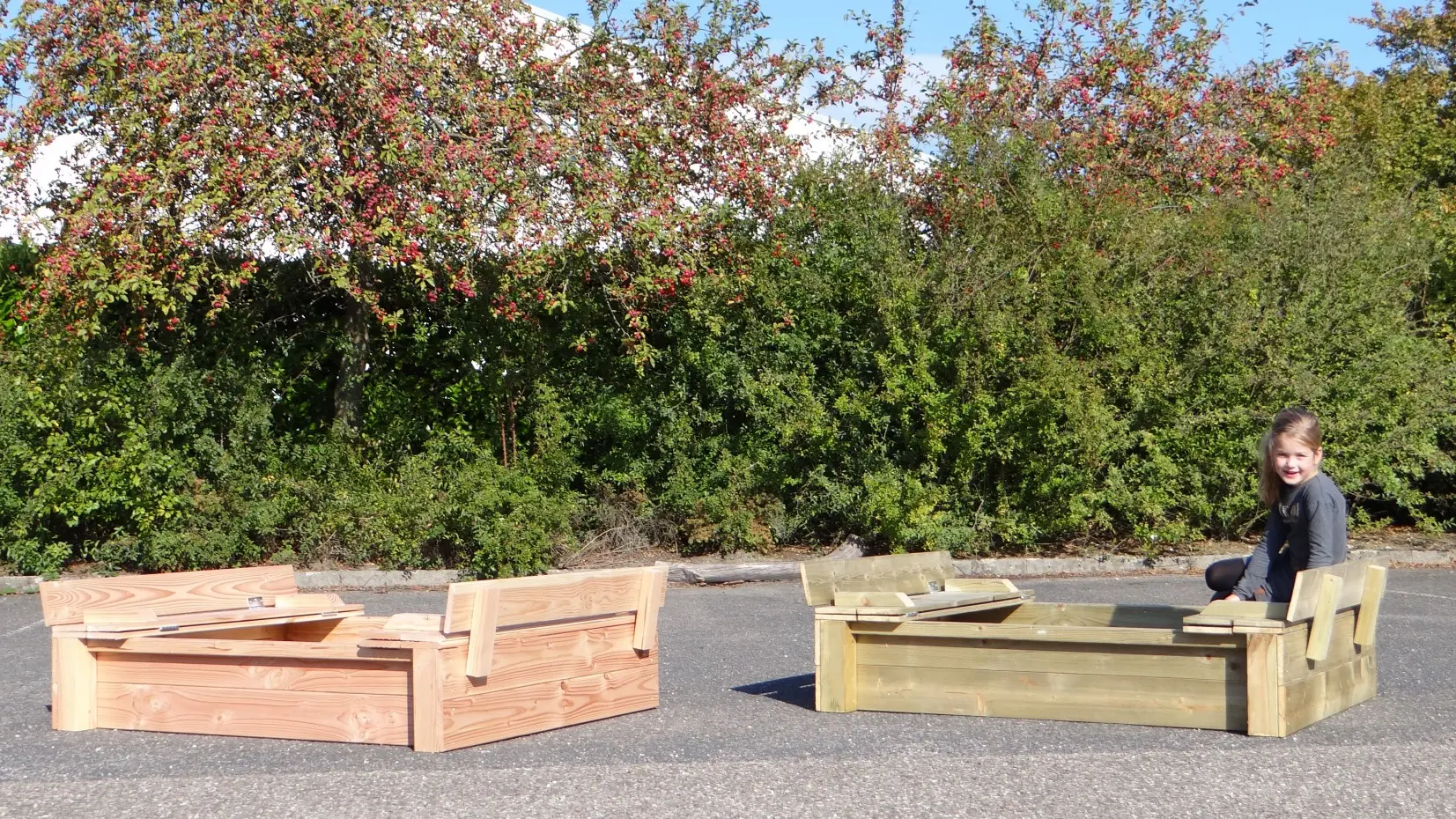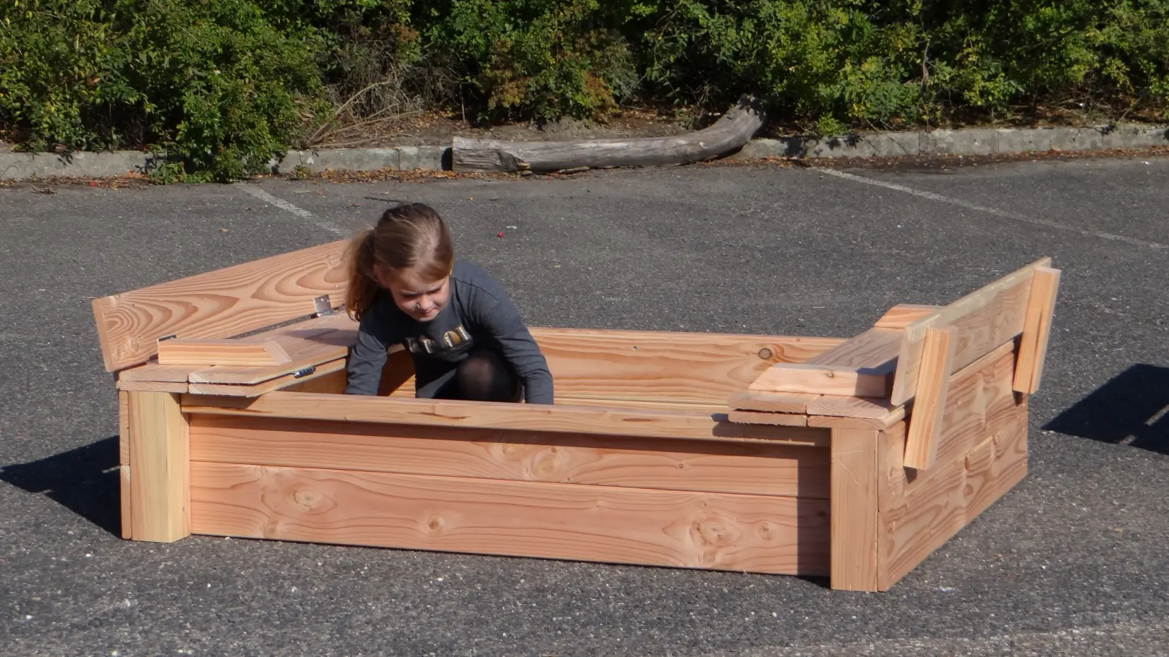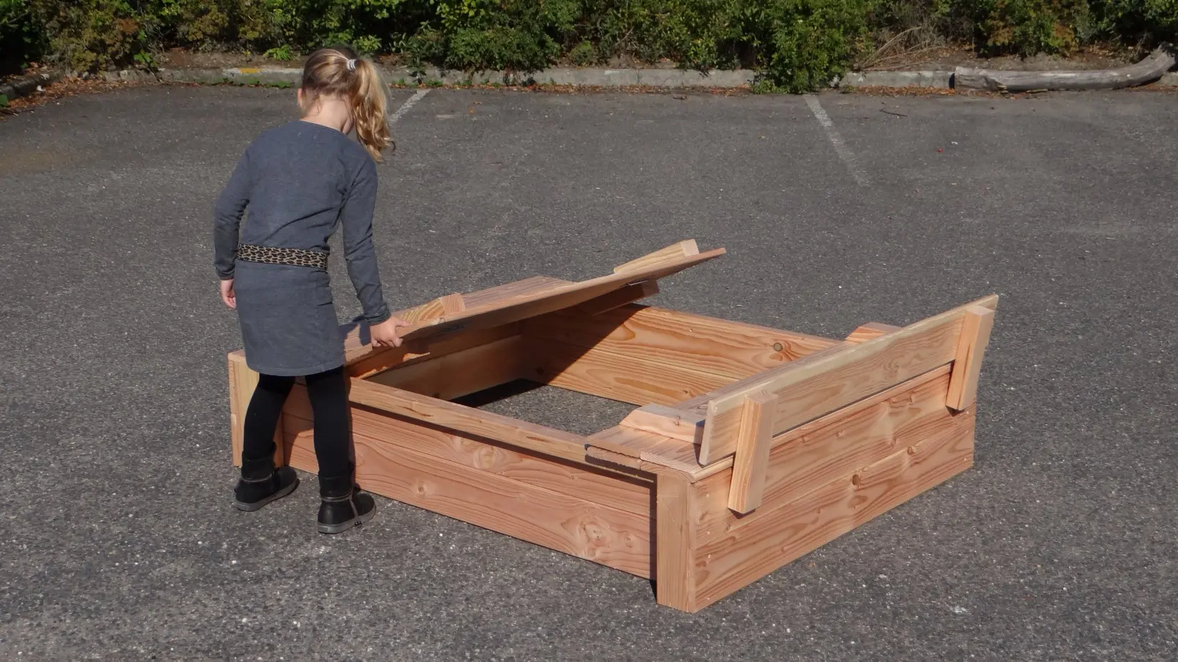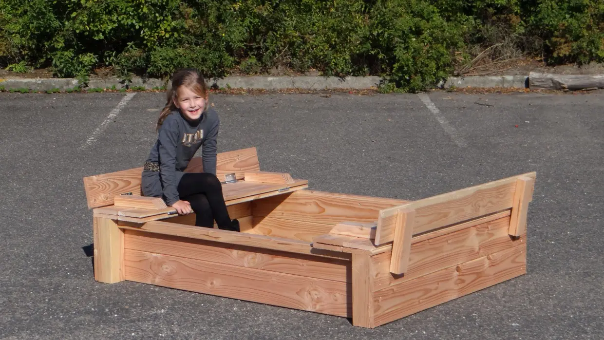 Beautiful, sturdy Douglas wood sandbox (120 x 150 cm). The sandbox is closable with a two-part lid, which also provides handy storage space. The lid can be positioned to serve as benches. The seating area is approximately 30 cm wide. Holds about 300 kg of sand.