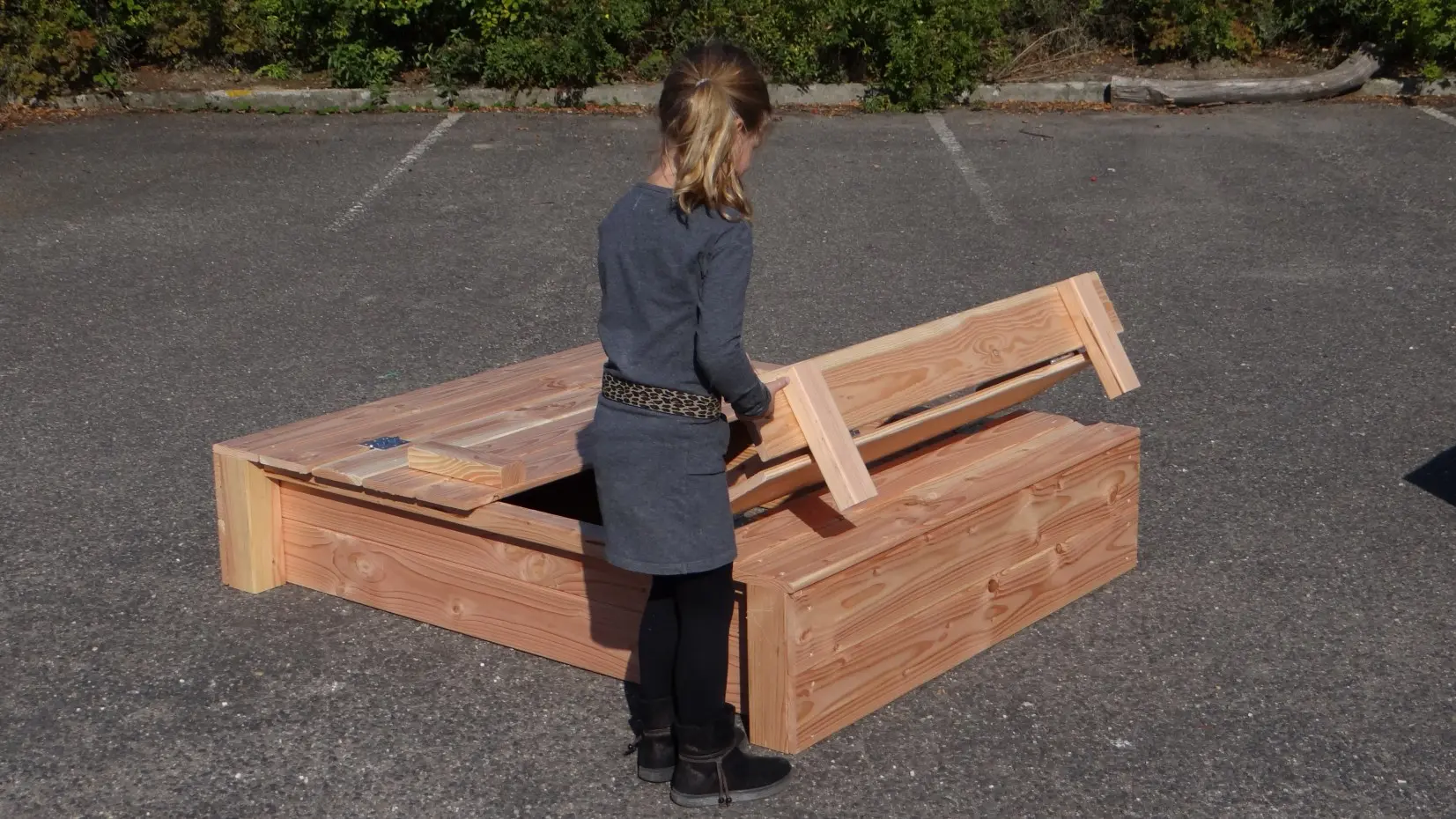 - Because the lid protrudes a little at the sides, you don't have to get your fingers between the wood to open and close the sandbox