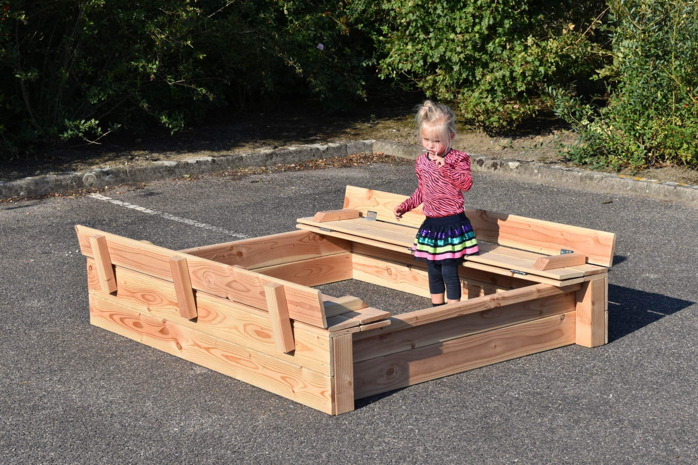 - The lid of the sandbox is easy to fold up, creating 2 benches