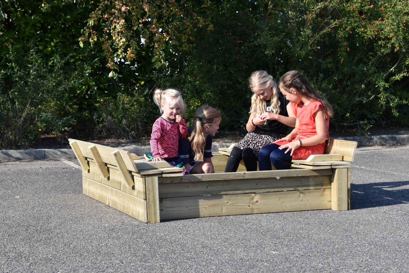 Large wooden sandbox made of impregnated pine wood. The Cubic sandbox has a lid that easily folds into two benches, each about 180 cm wide. The lid extends slightly beyond the sides of the sandbox, so no fingers get caught when opening or closing it. A thoughtful design, sturdy look, and very solid quality. This wooden sandbox holds approximately 450 kg of sand.