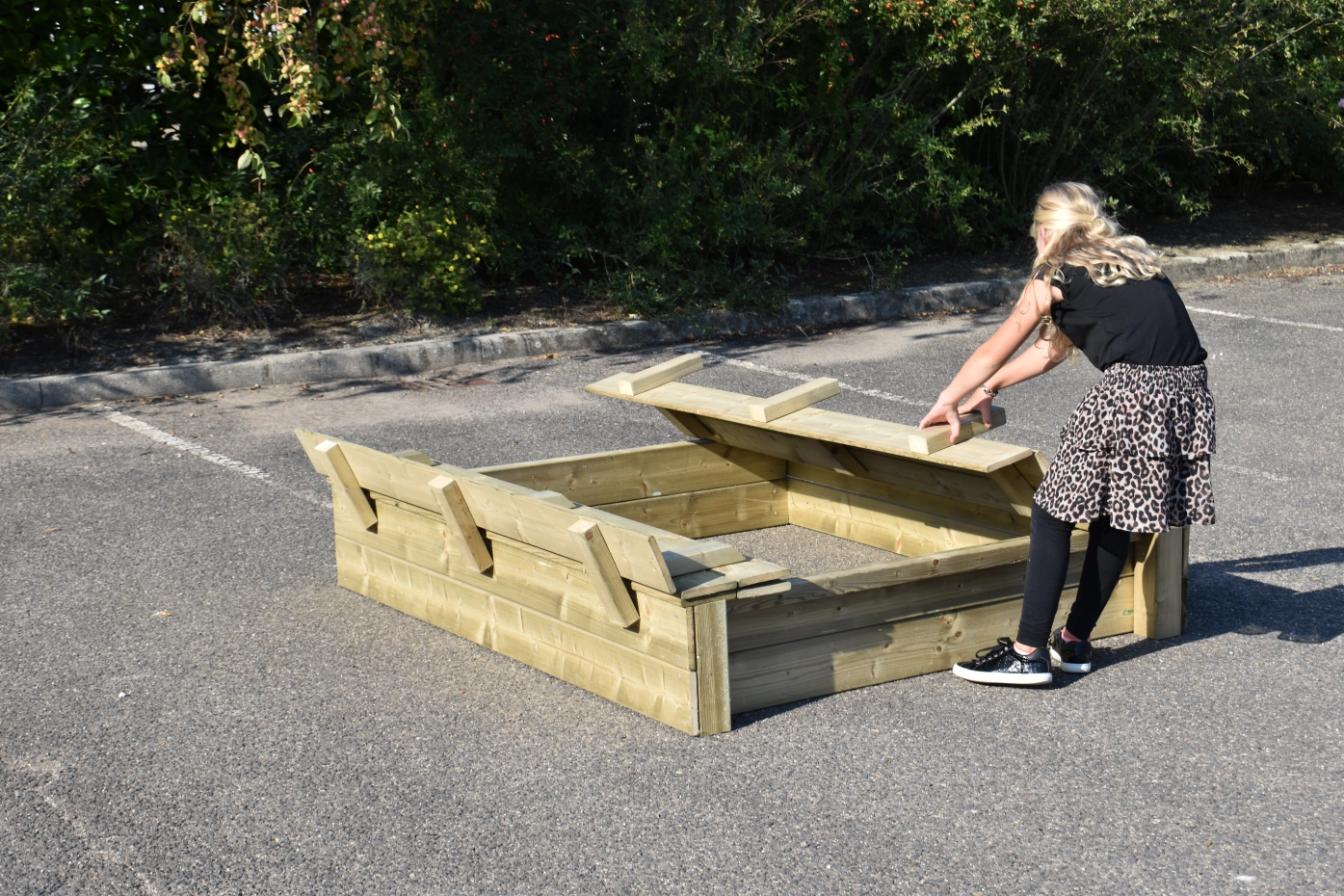 - The lid of the sandbox is easy to fold up, creating 2 benches