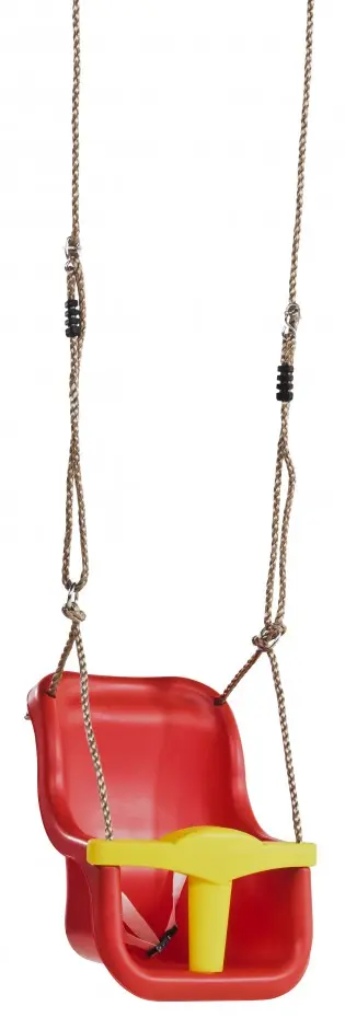 This fun red baby swing seat is equipped with a cheerful yellow T-piece. The baby seat has a safety strap, providing extra security. The baby swing seat is equipped with PP rope.