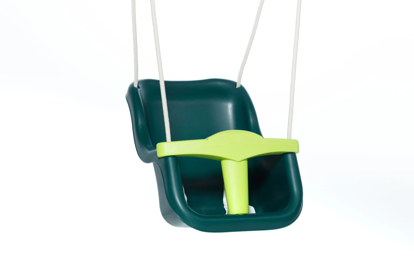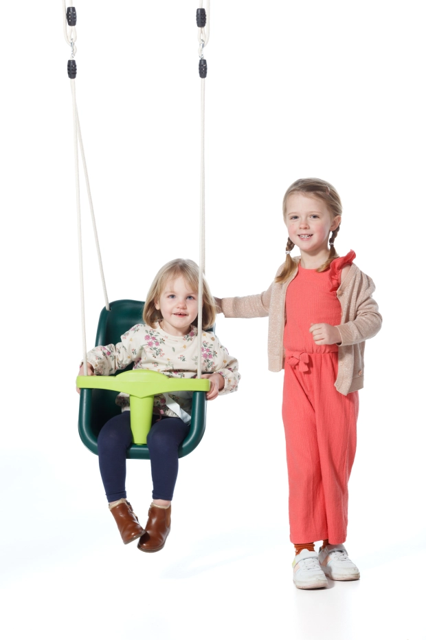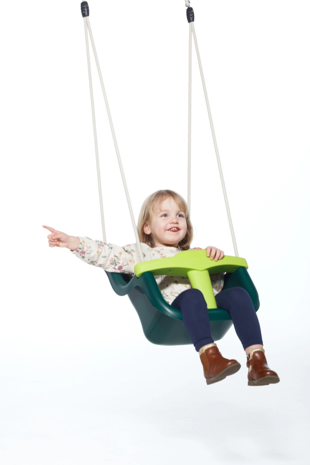 The luxury baby swing in dark green with a lime green T-piece is a real eye-catcher and pleasing to the eye. Thanks to the extra high backrest, your child’s head and neck are optimally supported. The baby swing seat is equipped with a T-piece and a safety strap for extra security. The special BR rope does not burn little hands, making it safe and comfortable to use.