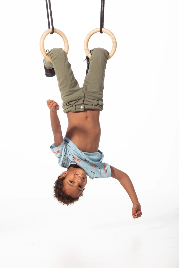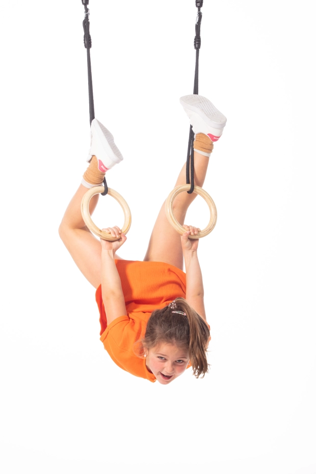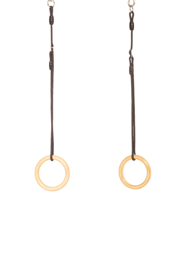 Wooden gym rings with black BR-rope. Unleash your acrobatic skills with these rings!