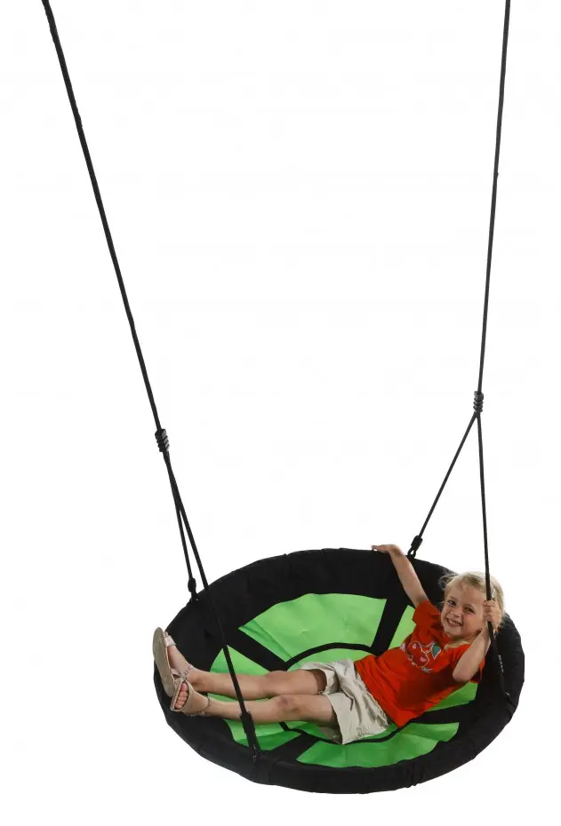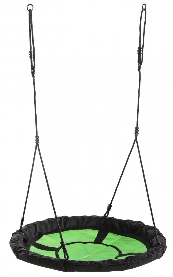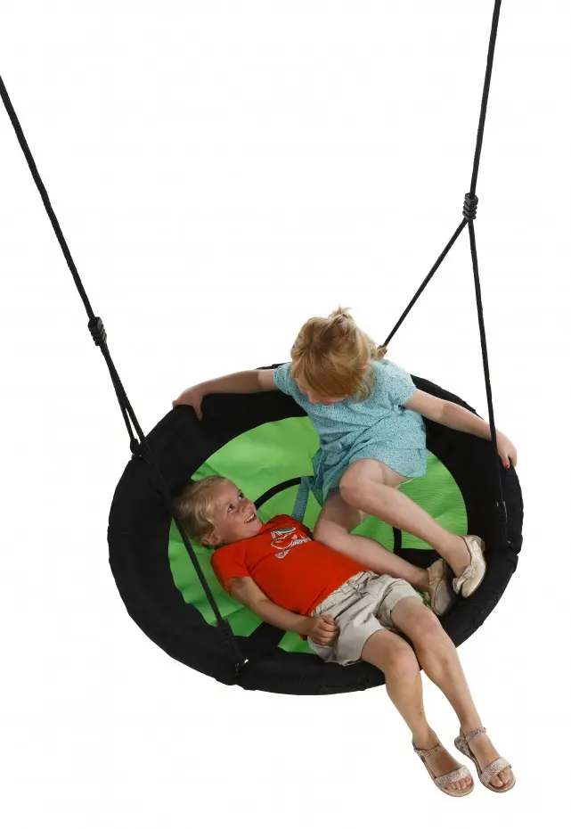 Nest swing Swibee Green is a beautiful nest swing for extra large fun! A fun, round nest swing with a diameter of 98 cm. On the Swibee nest swing, multiple children can swing at the same time. The green/black swing basket is equipped with black ropes.