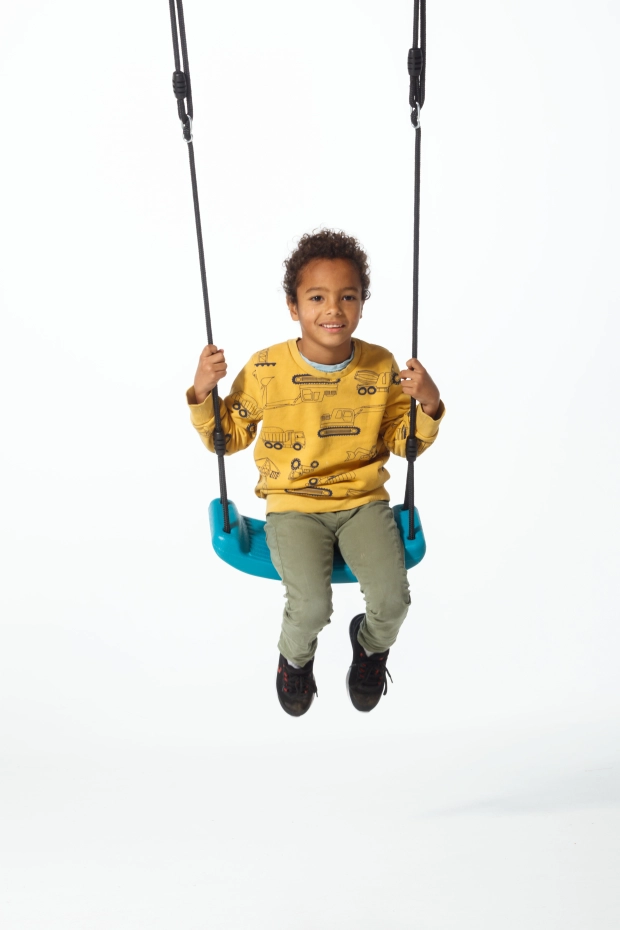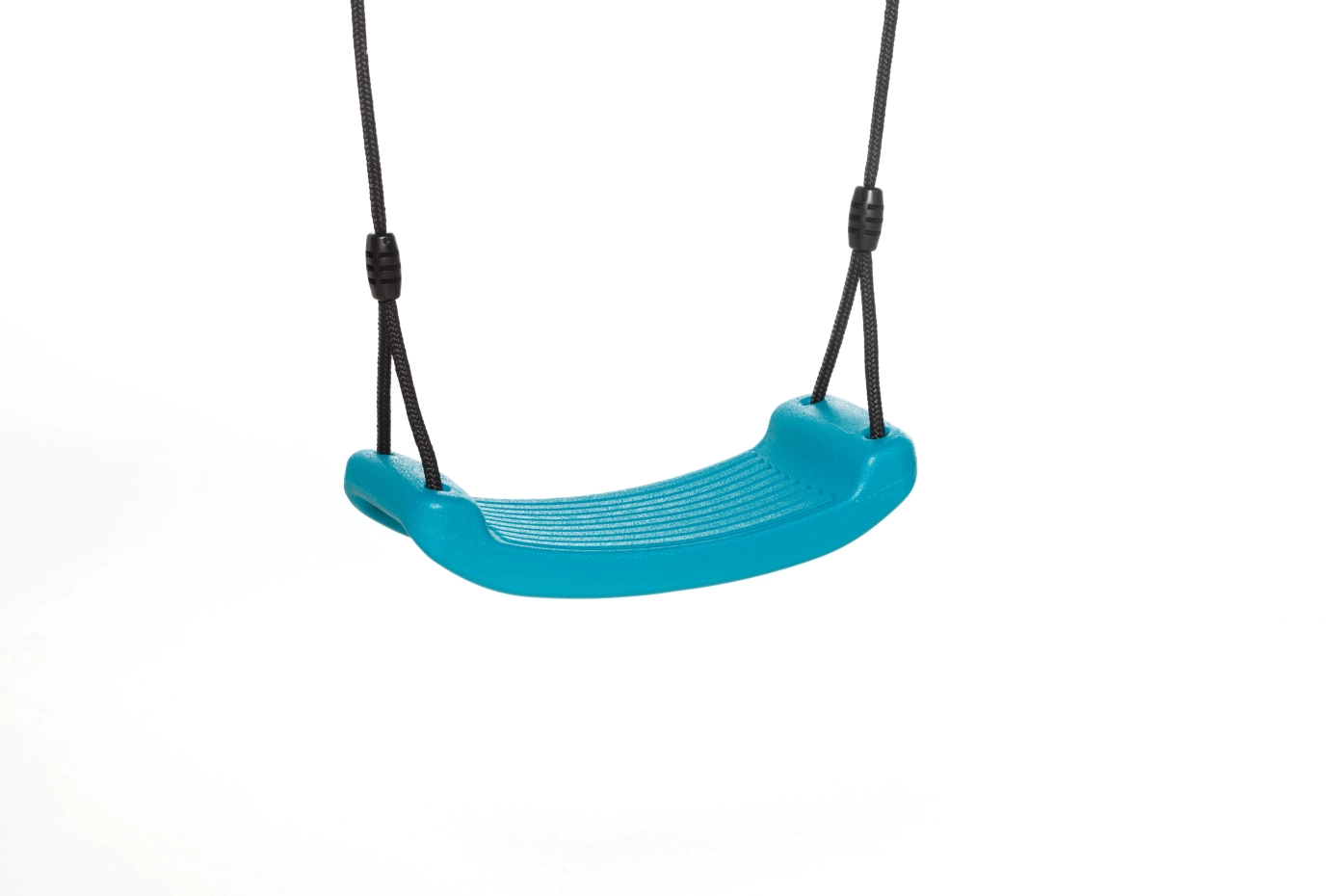 Swing seat made of plastic in the color turquoise. A sturdy swing, especially for children. The size is 42x17x8,5cm. This plastic swing seat is equipped with black BR rope. Rings and adjustable shafts made of galvanized steel.
