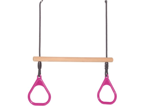 The wooden ring trapeze is equipped with plastic rings in pink color. Perform various tricks on the rings and trapeze. The ring trapeze guarantees lots of play fun!