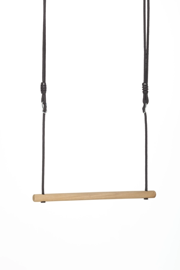 A wooden trapeze fitted with black BR rope. Live your acrobatic skills to the fullest with this ergonomically shaped trapeze made of impregnated wood!