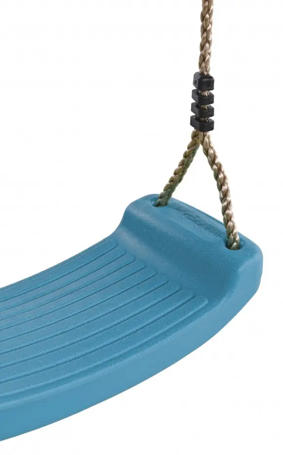 Plastic swing seat in the beautiful color turquoise, also known as apple green blue. The swing seat has 10mm thick PP ropes with hanging rings. The seat is made of blown plastic and has a maximum load capacity of 70kg.