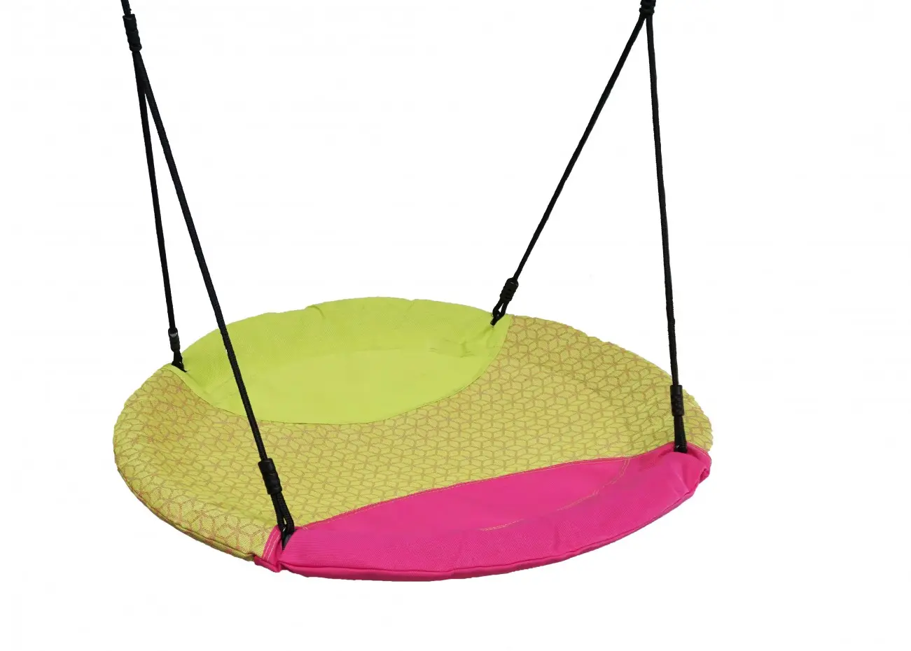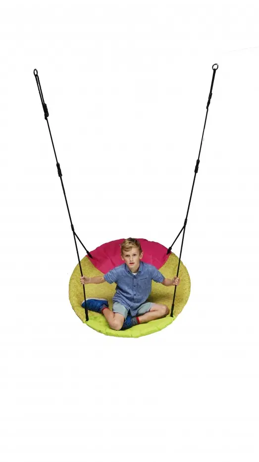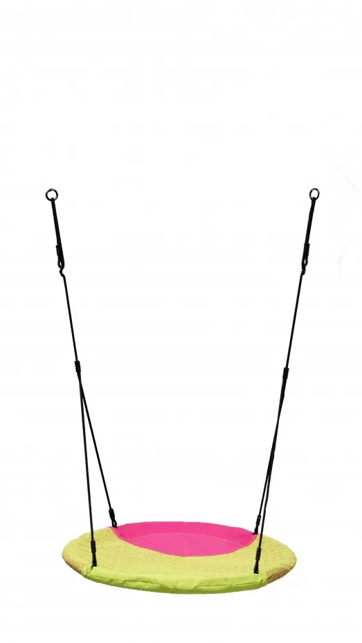 Nest swing Winkoh magenta/lime green is a round nest swing that ensures lots of playtime fun! Multiple children can swing, swirl, and play on this solid nest swing at the same time. The Winkoh nest swing is made of water-repellent fabric. The swing basket is equipped with black BR ropes, which are very child-friendly.