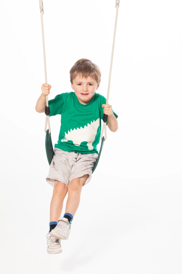 Soft swing seat in dark green with beige BR rope. This special rope doesn’t burn fingers. The flexible swing seat measures 66x14 cm and adapts to the child’s body.