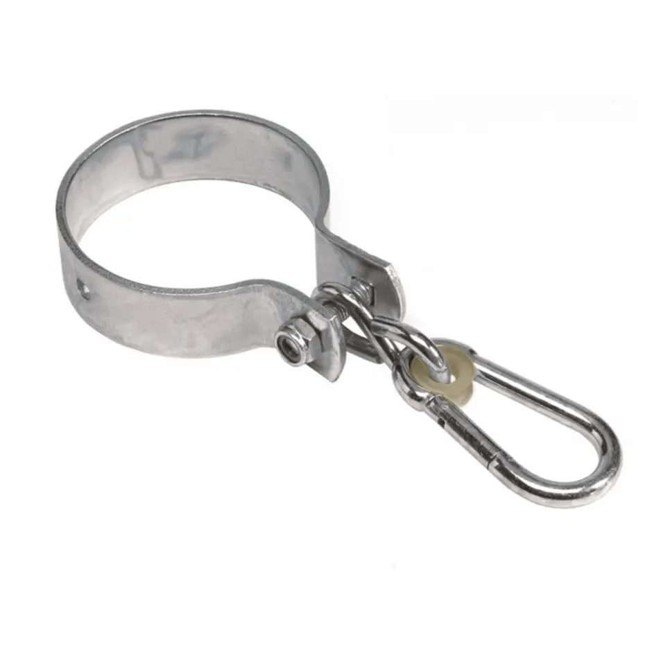 Swing hook with carabiner, suitable for round wooden swing posts Ø12cm. Easy mounting around a round wooden swing beam. The practical carabiner allows quick changing of swing seats on this swing hook.