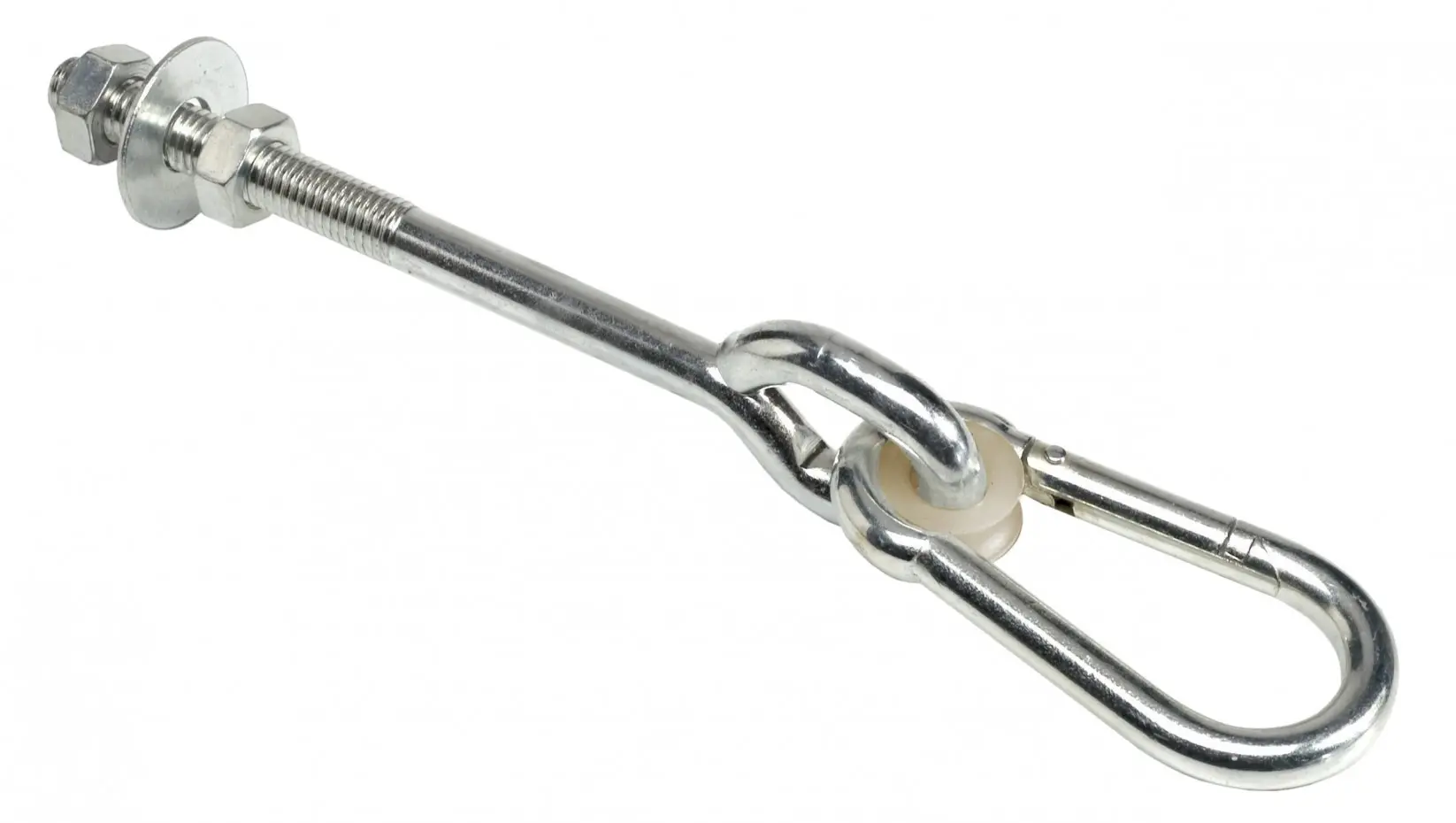 Swing hook for attachment through a hole in the swing beam. The swing hook comes with a carabiner, allowing swing seats to be changed quickly and easily. This 'Swing Hook Type O' has a shaft length of 10cm. Suitable for round wooden beams up to Ø8cm thick. Delivered per piece.