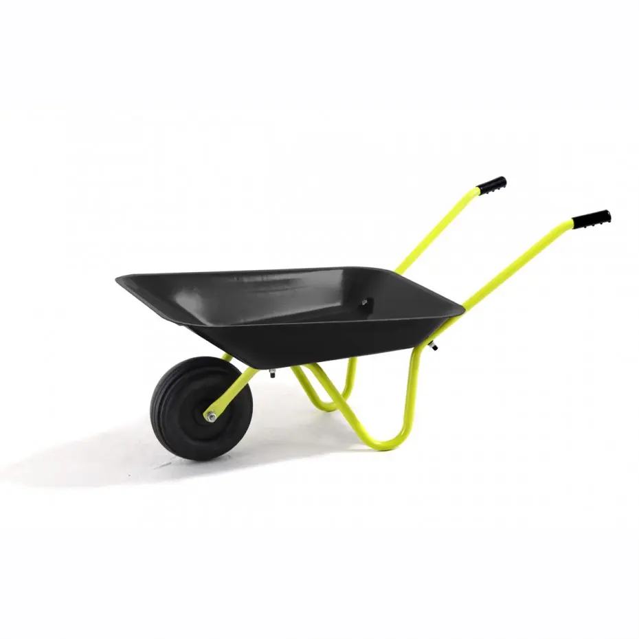 This wheelbarrow is made for children, so they can work in the garden as well. ✓ Tube with rubber handles ✓ Will be delivered as building kit ✓ Thickness of the steel: 0,6mm ✓ Max. volume: 20kg ✓ Dimensions: 75x38x28cm ✓ Frame colour: yellow/green ✓ Colour barrow: black