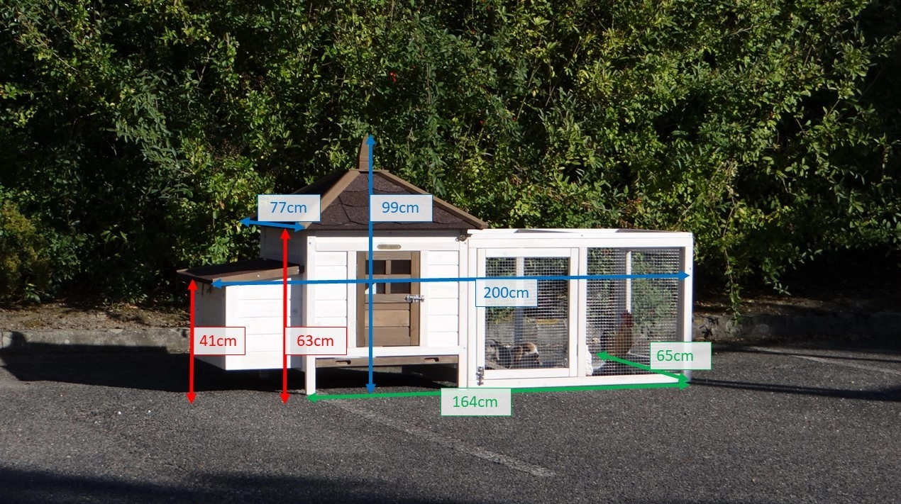 | Outer dimensions incl. roof and nest box (WxDxH) | 200x77x99cm |