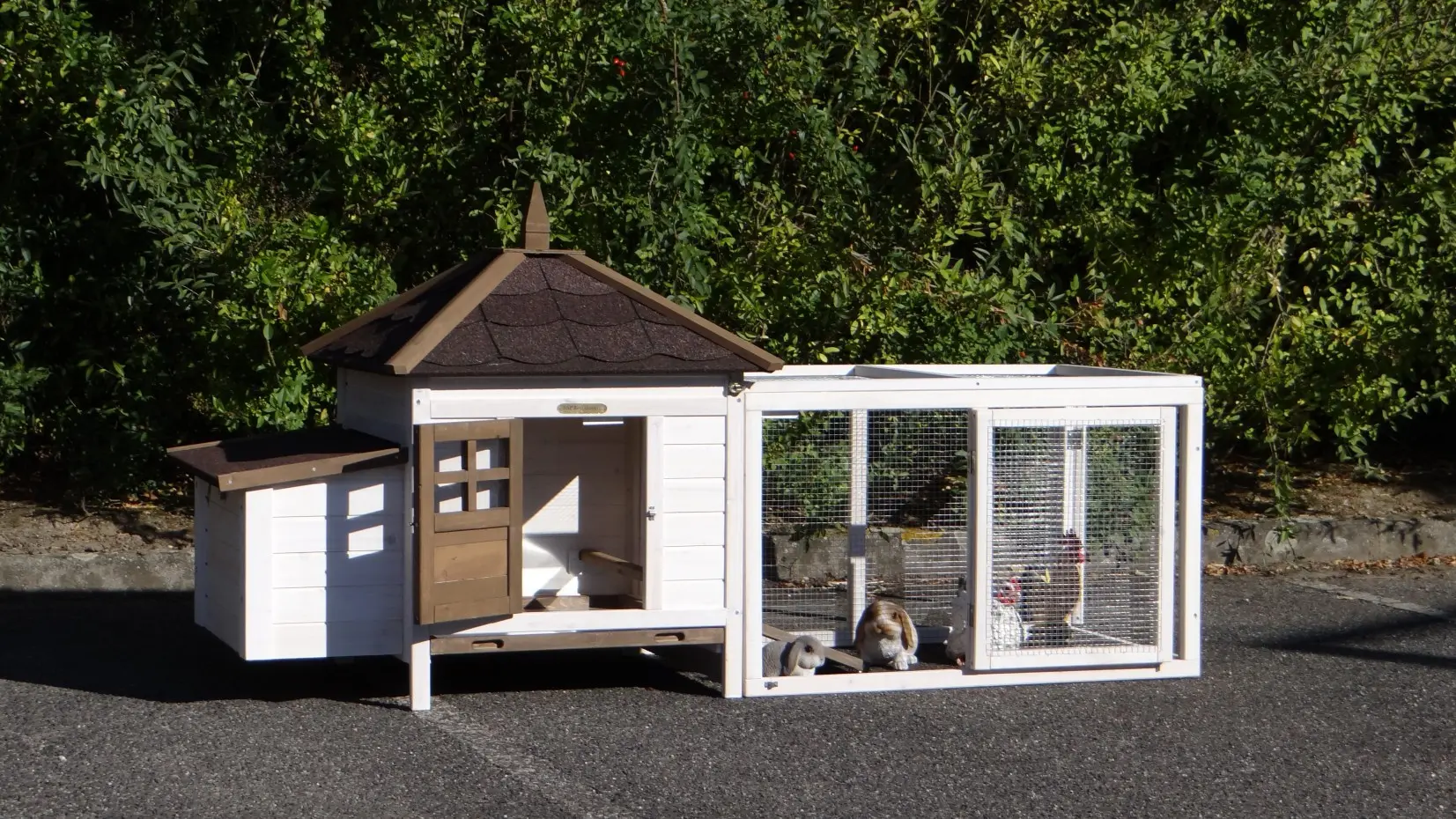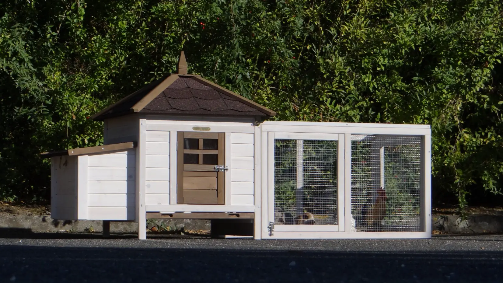 This rabbit hutch is actually a henhouse. However, it is very used for guinea pigs as well. You should keep in mind when you use it for guinea pigs, that this chicken coop doesn't contain any chewing protection. The hutch is provided with a tray, so that you can clean your sleeping compartment very easily.