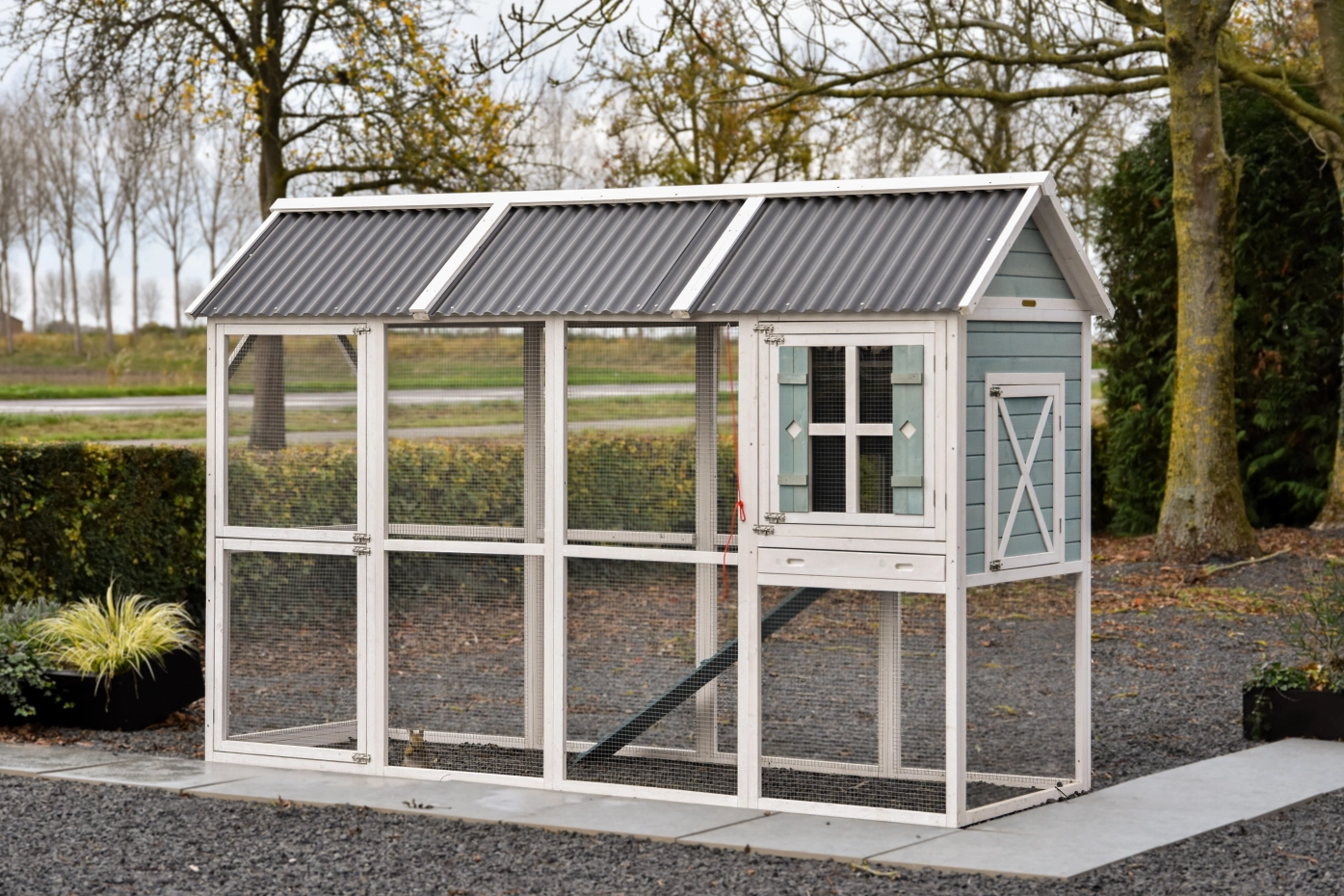 The spacious rabbit hutch Alexia is delivered in the colors white/gray-blue. The hutch has a generous run for the rabbits. The hatch of the night shelter can be operated from the outside with a cord. At the front of the night shelter, there is a double door. The first door can be opened without the rabbits being able to escape, thanks to the wire of the second door.