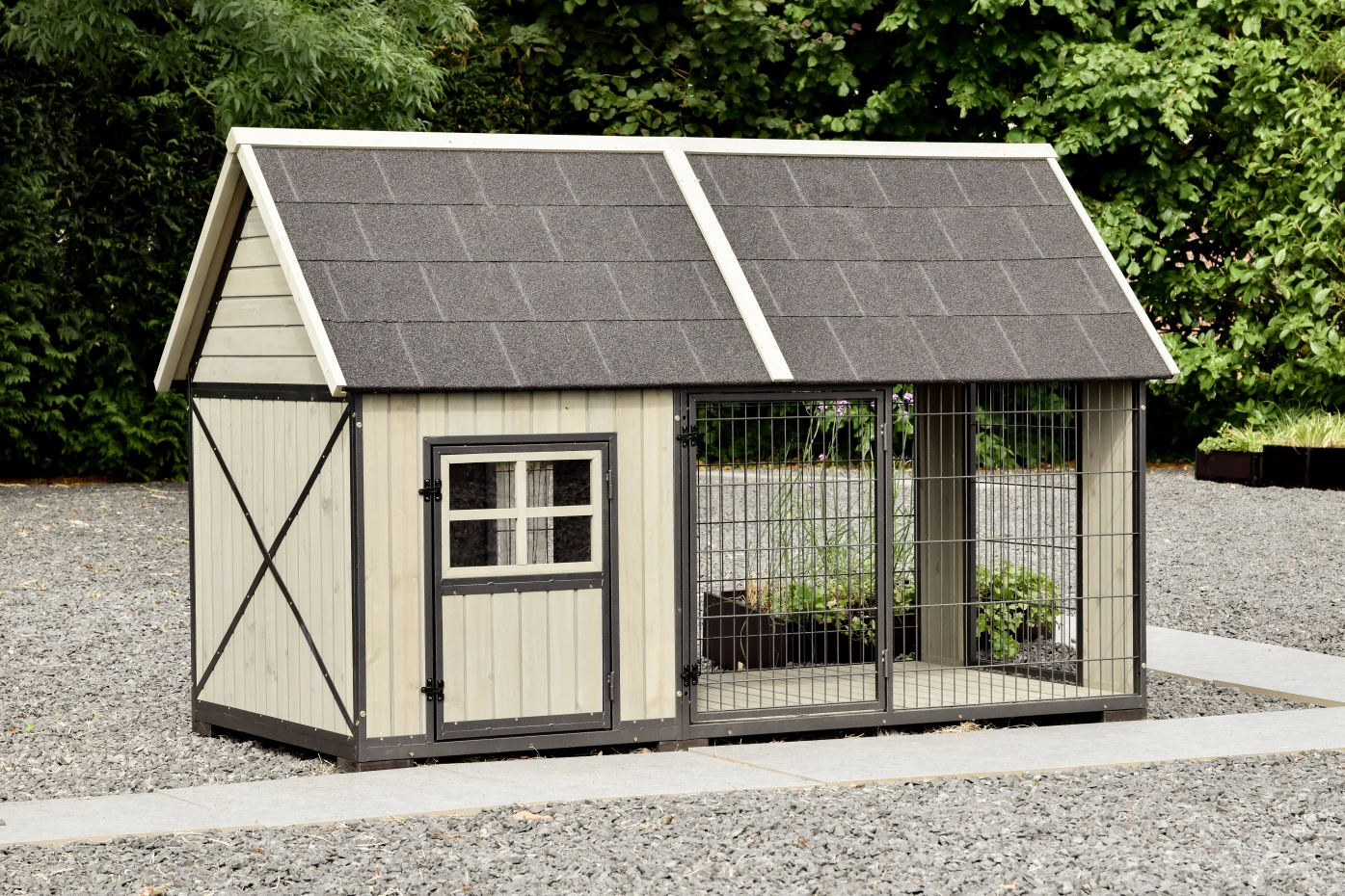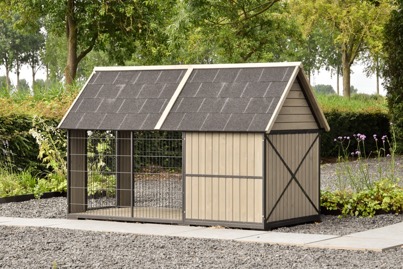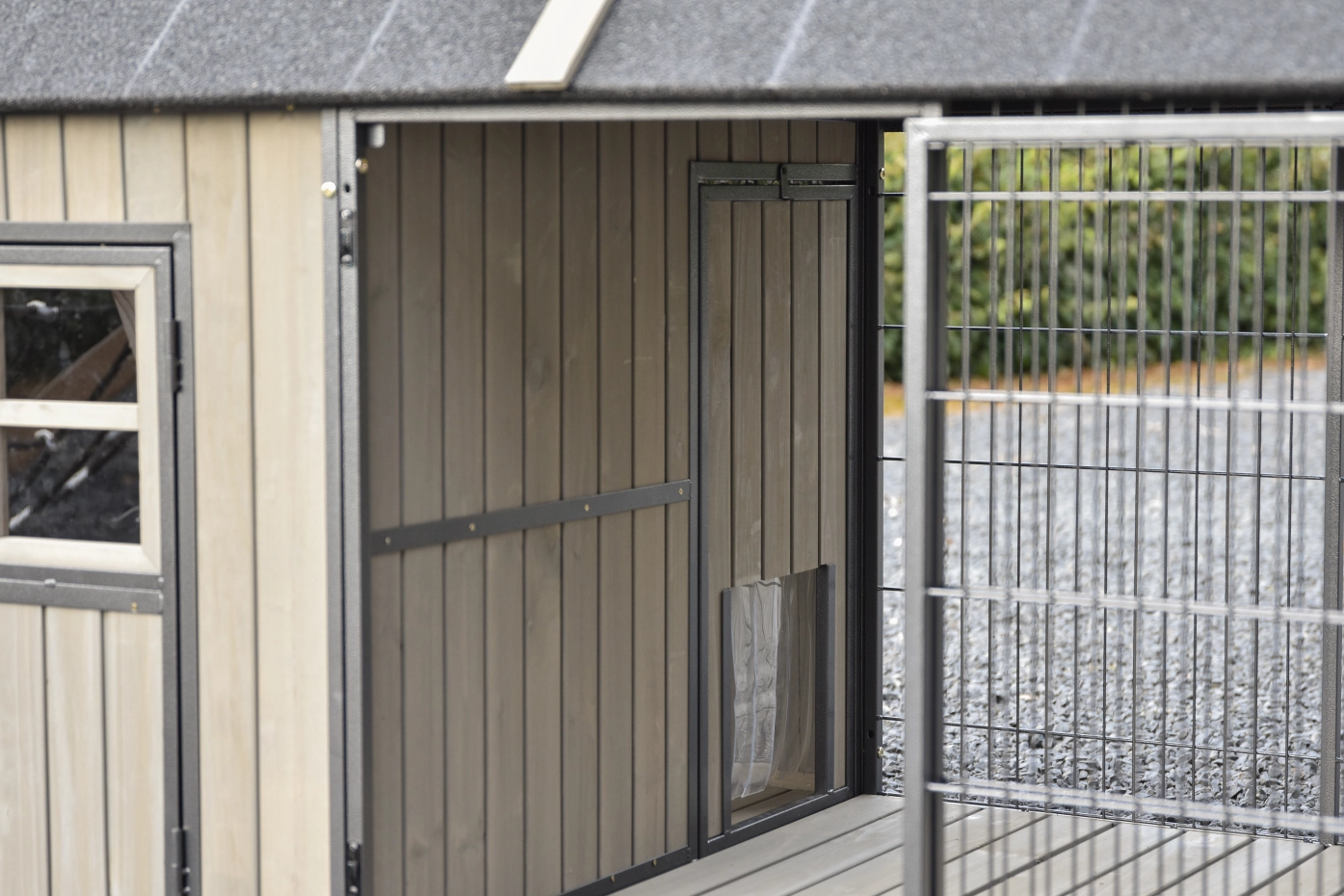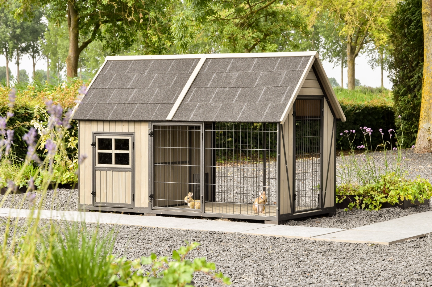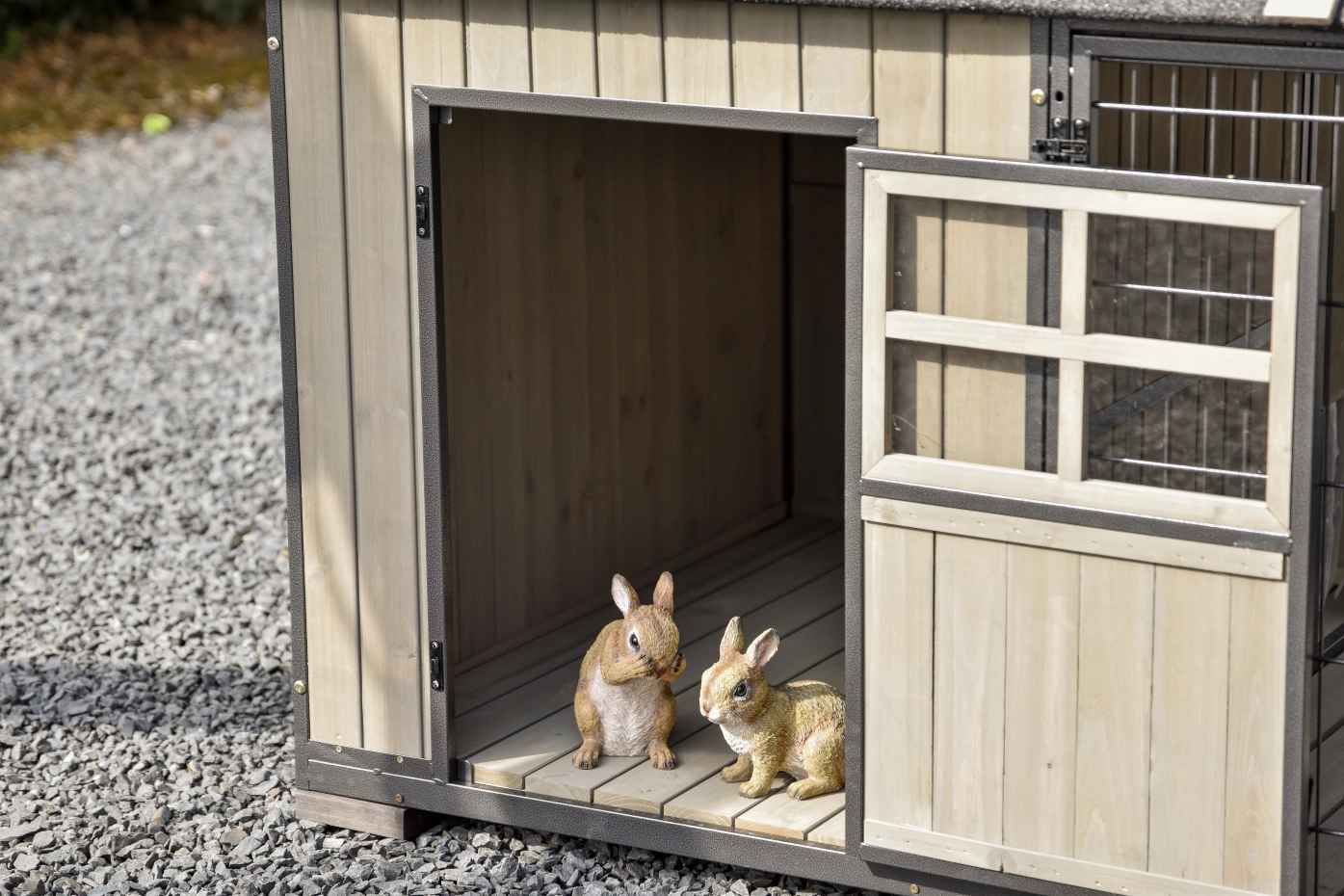 With its distinctive gabled roof, three access doors, and wooden floor, this rabbit hutch is not only practical but also pleasant to use.