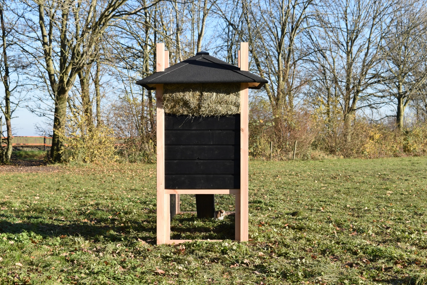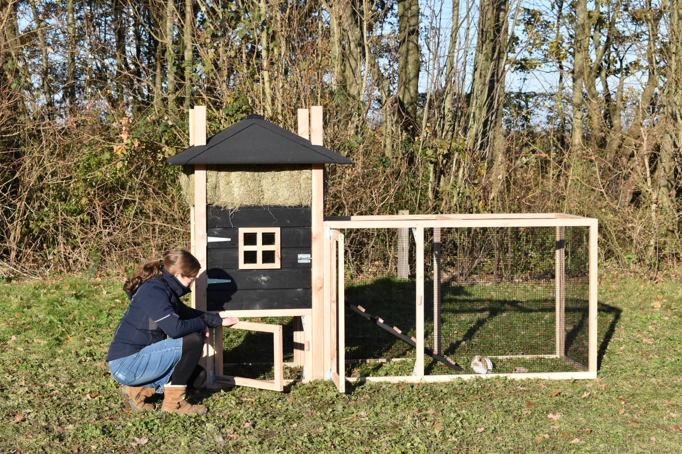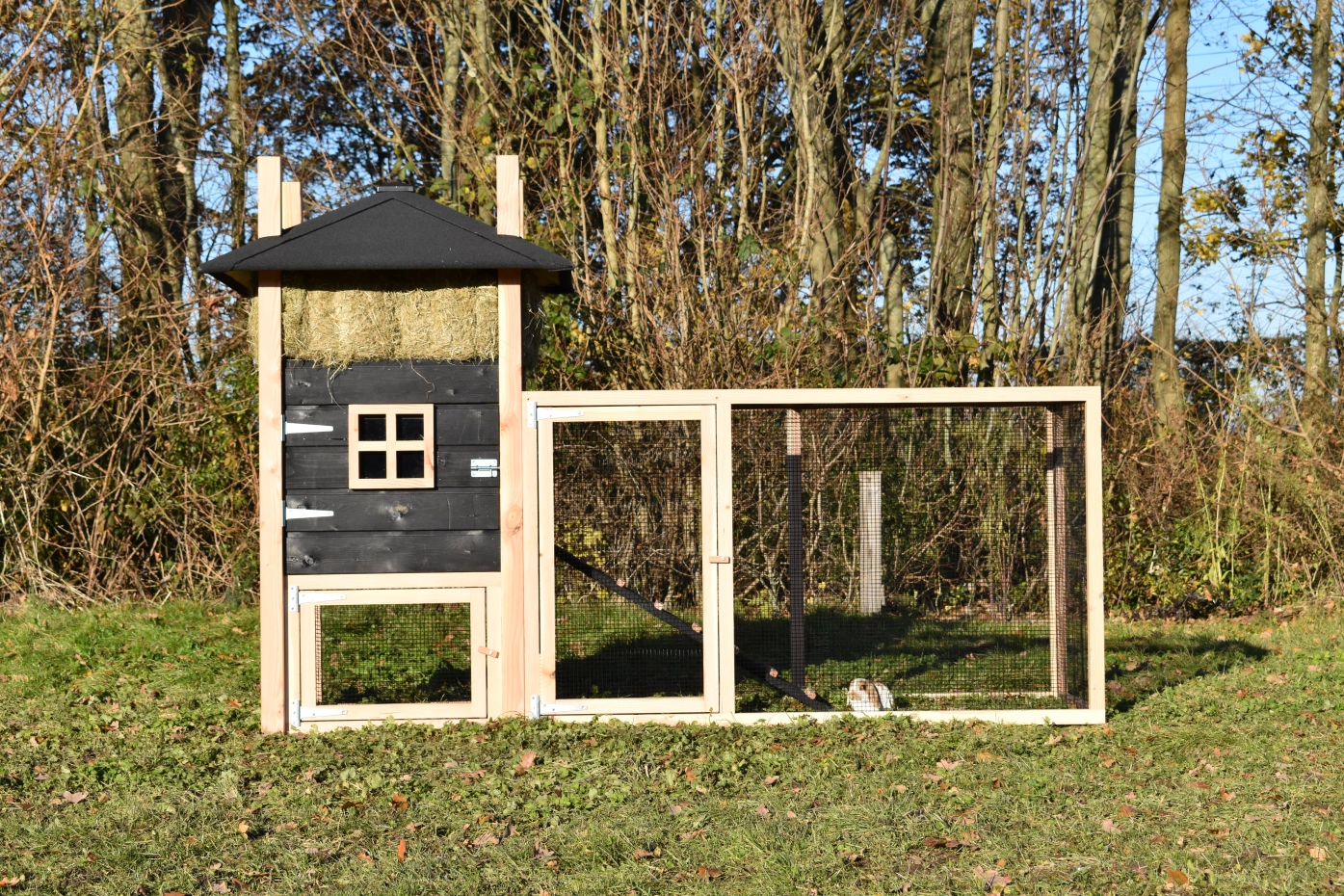 Rabbit hutch haystack Rosalynn is an acquisition for your garden. You can easily order hay with it. Because of the large run your rabbits have a lot of space. Because of the large door you can clean the sleeping compartment very easily. This hutch is made of Douglaswood and black impregnated wood. In short, a hutch of the best quality!