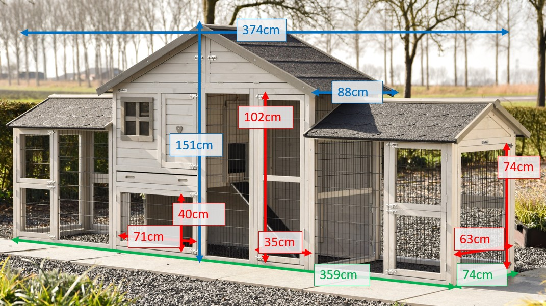 | Outer dimensions incl. roof and nest box (WxDxH) | 374x88x151cm |
