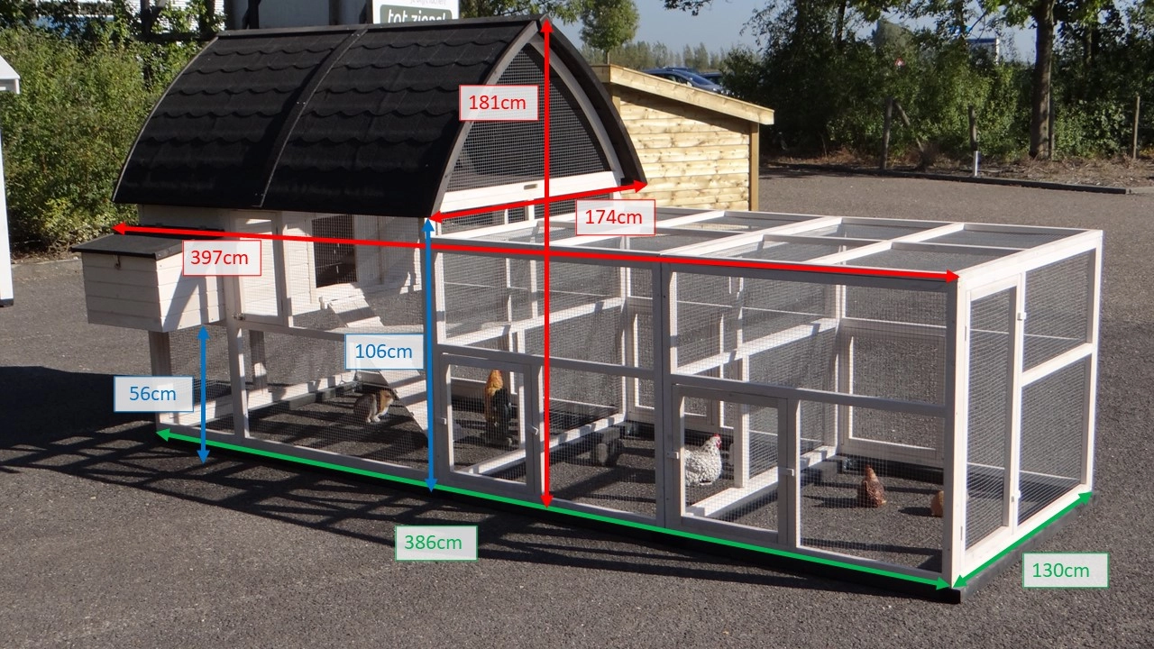 | Outer dimensions incl. roof and nest box (WxDxH) | 397x174x181cm |